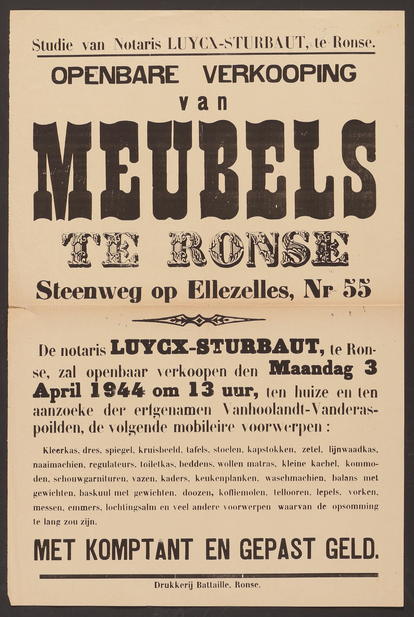 - opschriften: Studie van Notaris Luycx-Sturbaut, te Ronse, / openbare verkooping / van / meubels / te Ronse / Steenweg op Ellezelles, Nr. 55 / De notaris Luycx-Sturbaut, te Ron- / se, zal openbaar verkoopen den Maandag 3 / April 1944 om 13 uur, ten huize en ten / aanzo