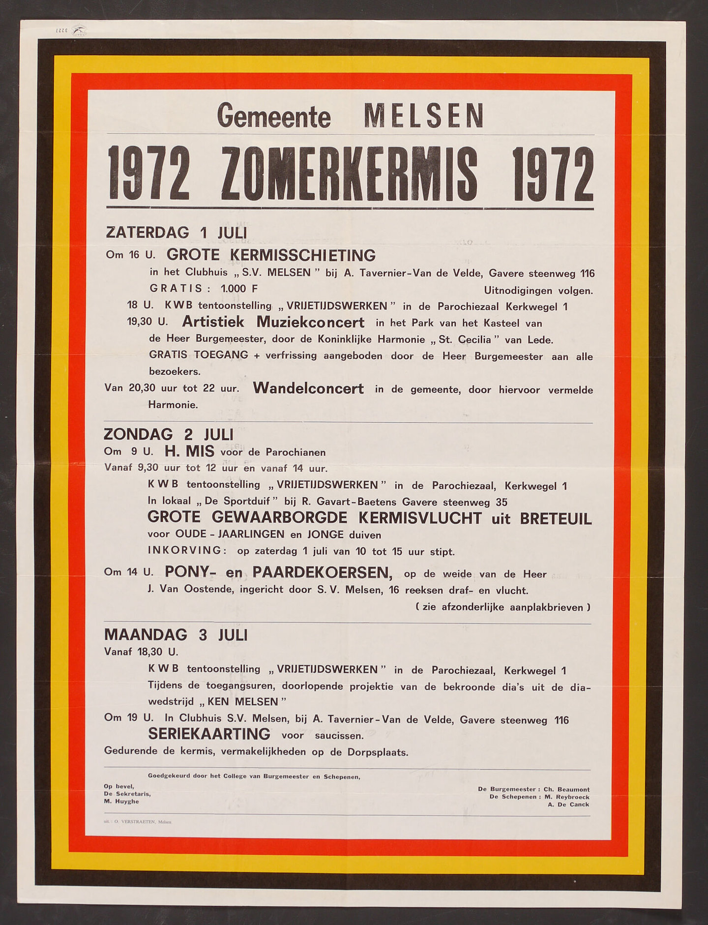 - opschriften: Gemeente MELSEN / 1972 ZOMERKERMIS 1972 / ZATERDAG 1 JULI / om 16 U. GROTE KERMISSCHIETING / in het Clubhuis "S.V. MELSEN" bij A. Tavernier-Van de Velde, Gavere steenweg 116 / GRATIS : 1000 F Uitnodigingen volgen. / 18 U. KWB tentoonstelling "VRIJETIJDS