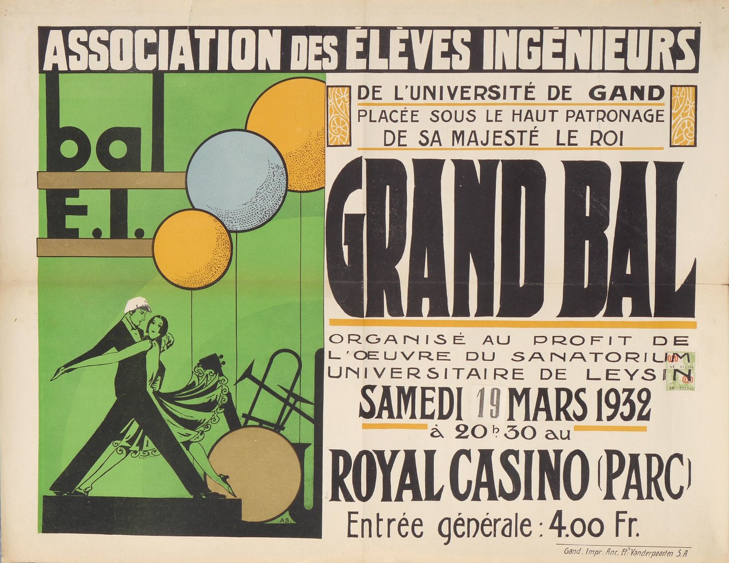 - opschriften: ASSOCIATION DES ÉLÈVES INGÉNIEURS / bal / E.I. / DE L'UNIVERSITÉ DE GAND / PLACÉE SOUS LE HAUT PATRONAGE / DE SA MAJESTÉ LE ROI / GRAND BAL / ORGANISÉ AU PROFIT DE / L' OEUVRE DU SANATORIUM / UNIVERSITAIRE DE LEYSIN / SAMEDI 19 MARS 1932 / á 2O h 3O au /