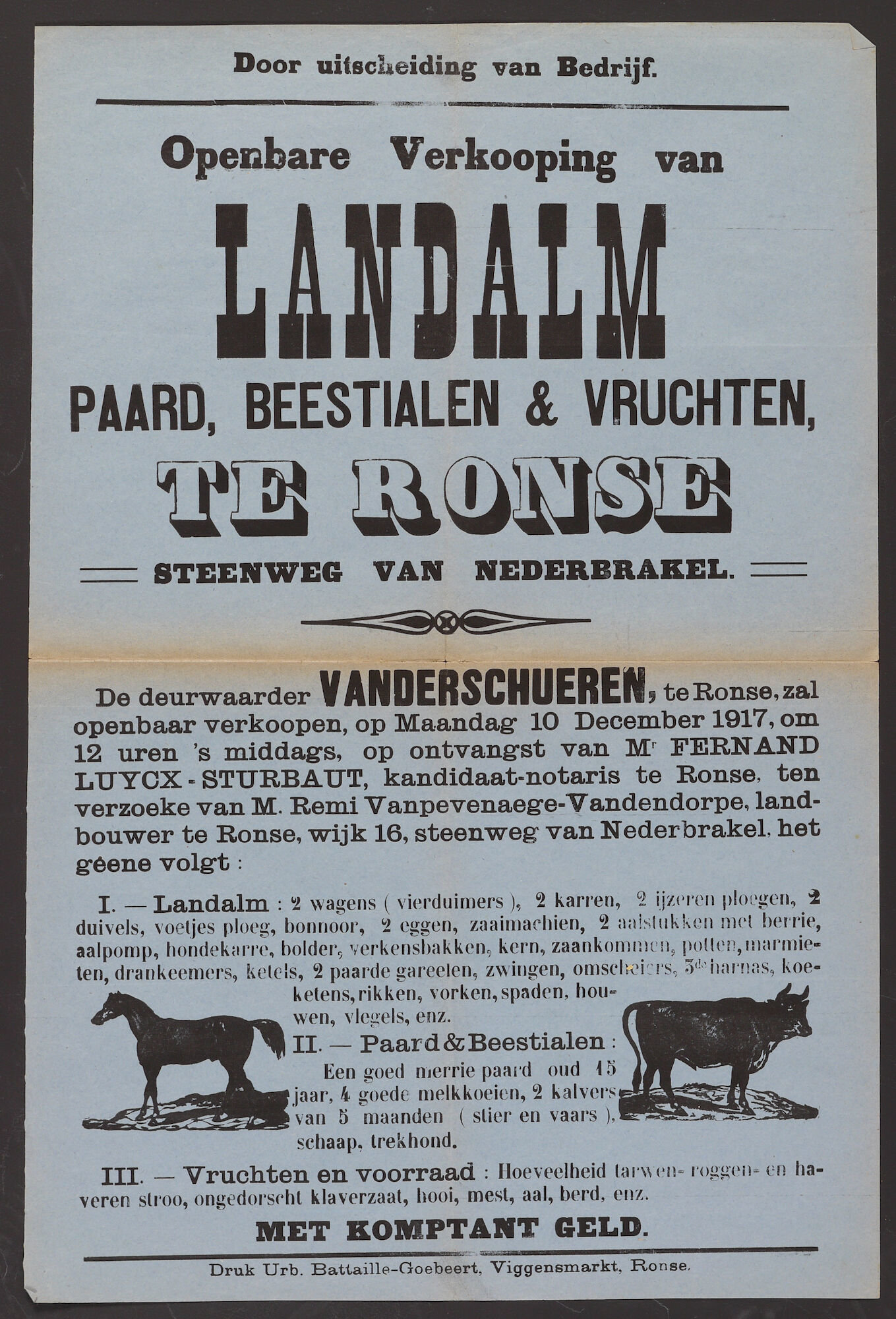 - opschriften: Door uitscheiding van Bedrijf. / Openbare Verkooping van / landalm / paard, beestialen & vruchten, / te Ronse / Steenweg van Nederbrakel. / De deurwaarder Vanderschueren, te Ronse, zal / openbaar verkoopen, op Maandag 10 December 1917, om / 12 uren 's mid