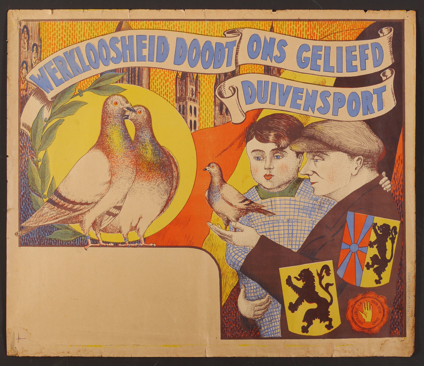 - opschriften: WERKLOOSHEID DOODT ONS GELIEFD / DUIVENSPORT / (DISTILLERIE LA MAIN D'OR GAND) / LITHO CRISTEL - WINDEY - GAND