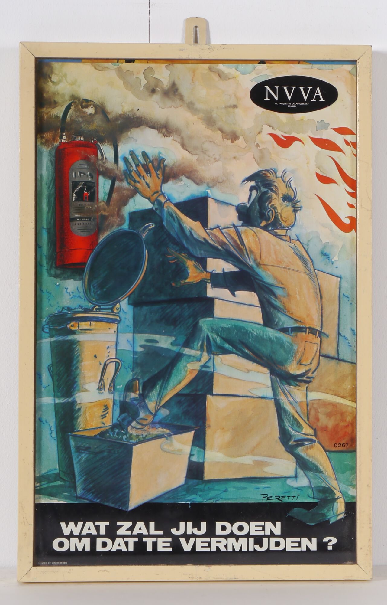 - opschriften: NVVA / 15, JAQUES DE LALAINGSTRAAT / BRUSSEL / 0267 / Peretti / WAT ZAL JIJ DOEN / OM DAT TE VERMIJDEN? / PRINTED BY LITHOCHROMA