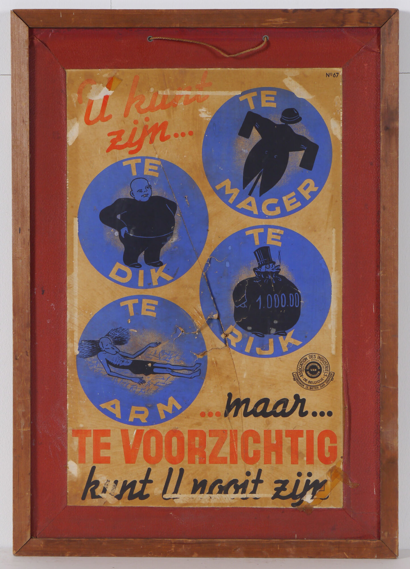 - opschriften: U kunt zijn... TE MAGER / TE DIK / TE RIJK / TE ARM / ... maar ... TE VOORZICHTIG kunt U nooit zijn // ASSOCIATION DES INDUSTRIELS DE BELGIQUE / PRÉVENTION DES ACCIDENTS / PRÉVENIR VAUT MEUX QUE RÉPARER / Nr 67