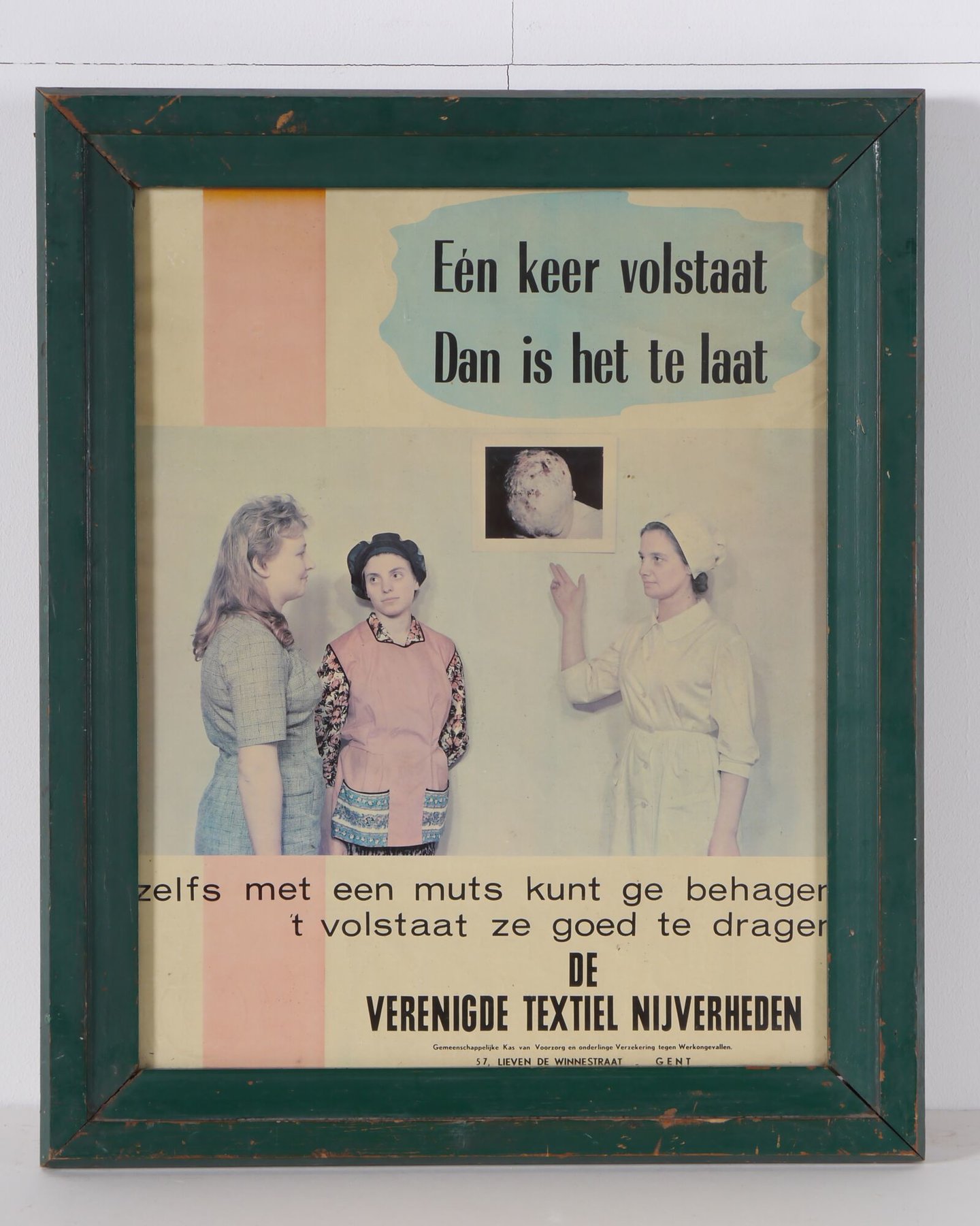 - opschriften: Eén keer volstaat / Dan is het te laat / zelfs met een muts kunt ge behagen / 't volstaat ze goed te dragen / De / Verenigde Textiel Nijverheden / Gemeenschappelijke Kas van Voorzorg en onderlinge Verzekering tegen Werkongevallen. / 57, Lieven De Winnestr