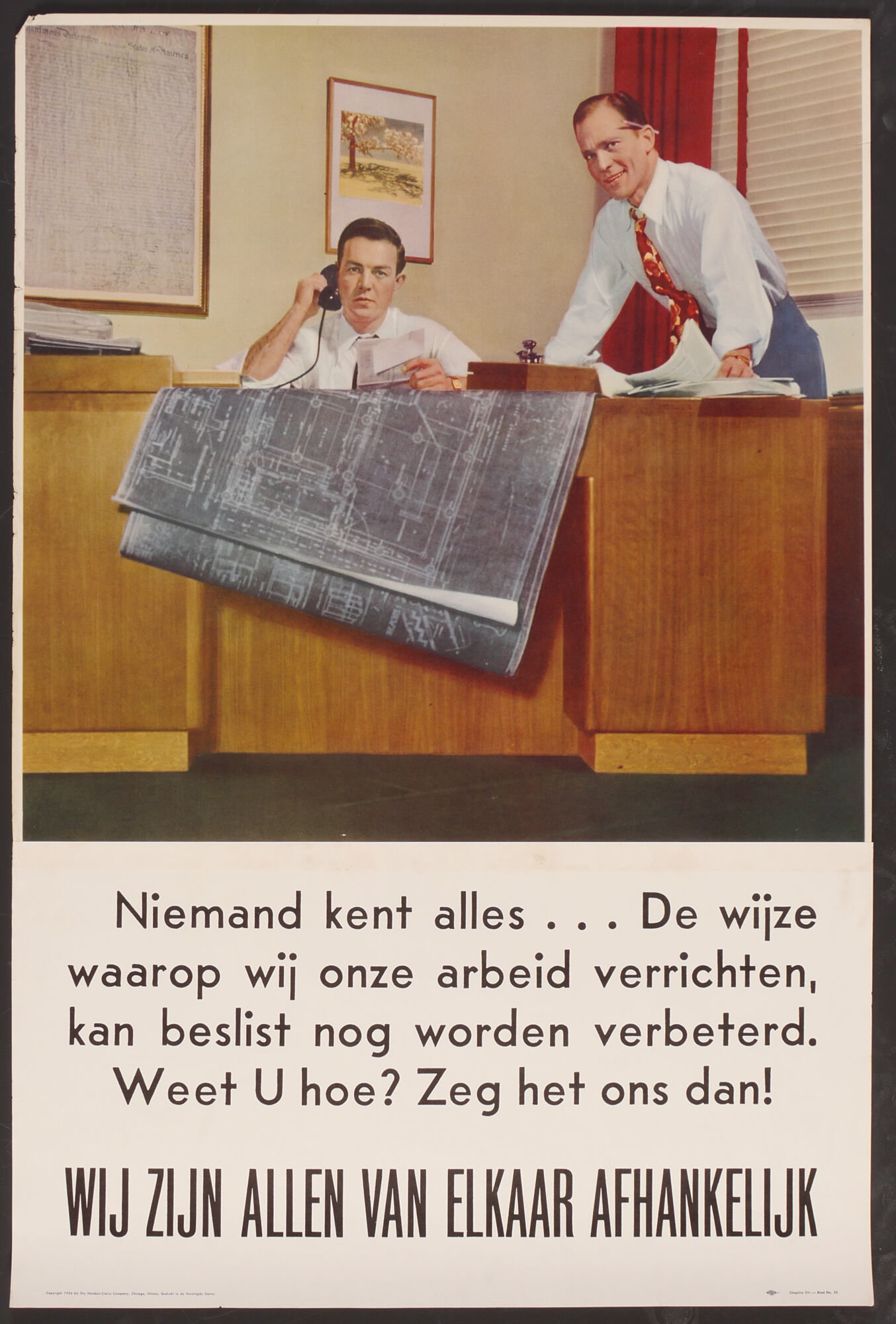 - opschriften: Niemand kent alles De wijze / waarop wij onze arbeid verrichten, / kan beslist nog worden verbeterd. / Weet U hoe? Zeg het ons dan! / WIJ ZIJN ALLEN VAN ELKAAR AFHANKELIJK