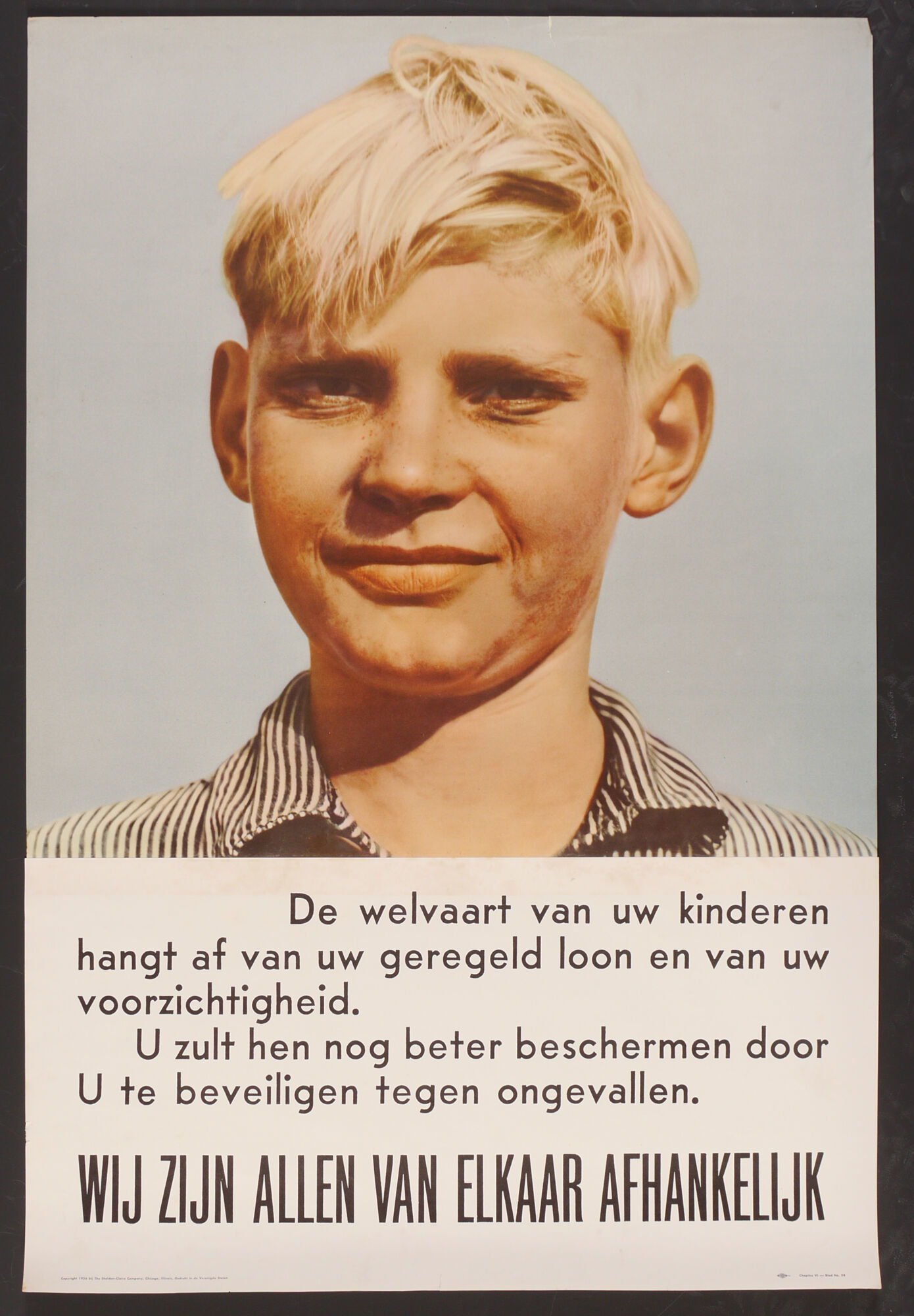 - opschriften: De welvaart van uw kinderen / hangt af van uw geregeld loon en van uw / voorzichtigheid. / U zult hen nog beter beschermen door / U te beveiligen tegen ongevallen. / WIJ ZIJN ALLEN VAN ELKAAR AFHANKELIJK