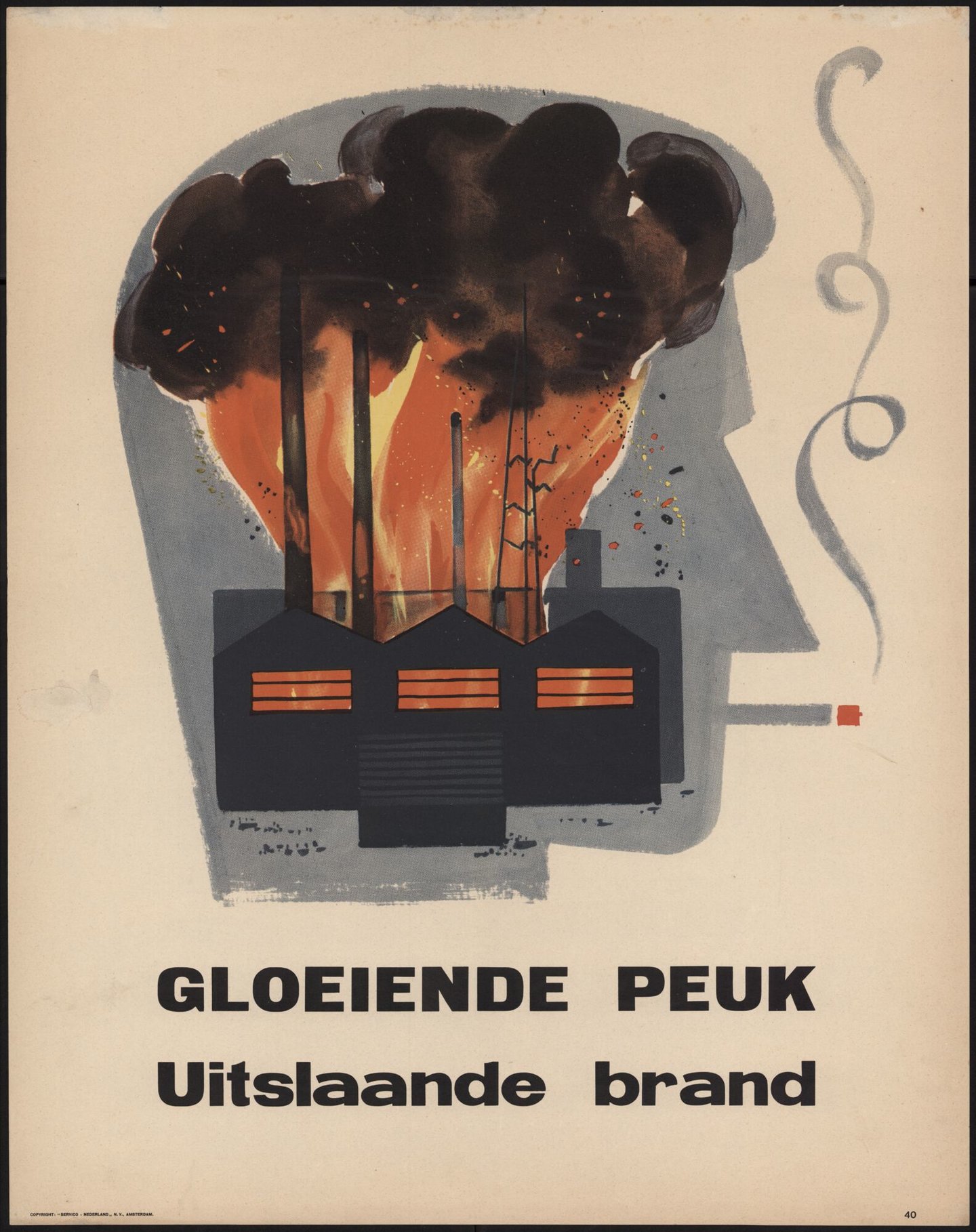 - opschriften: Gloeiende peuk, uitslaande brand // COPYRIGHT: "SERVICO-NEDERLAND" N.V. AMSTERDAM // 40