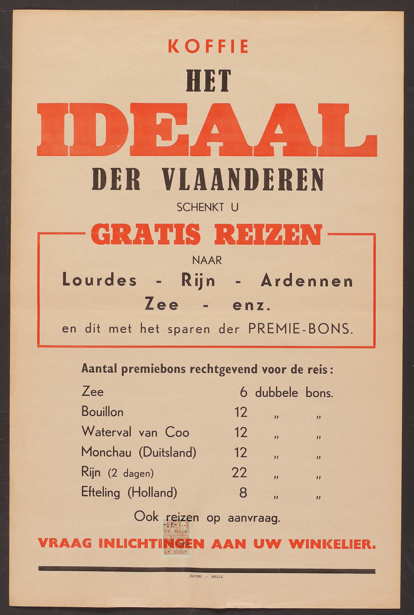 - opschriften: Koffie / Het / Ideaal / der Vlaanderen / schenkt u / gratis reizen / naar / Lourdes - Rijn - Ardennen / Zee - enz. / en dit met het sparen der premie-bons / ... / Vraag inlichtingen aan uw winkelier.