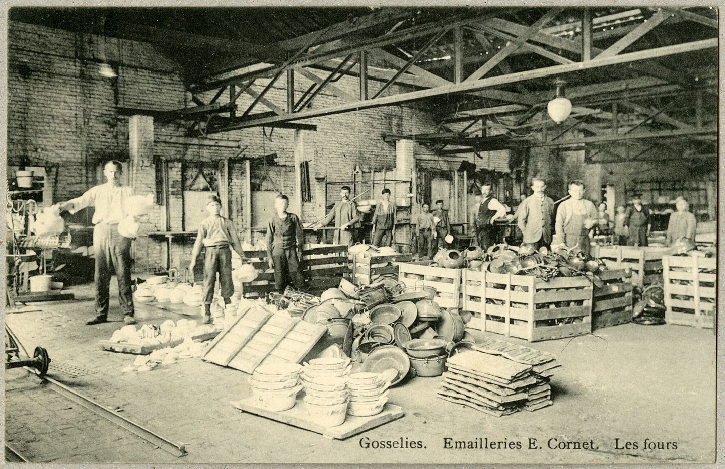Werkvolk, waaronder jonge jongens, poserend bij de afgewerkte geëmailleerde producten zoals potten en pannen, en andere dagelijkse gebruiksvoorwerpen, die uit de ovens komen. De bakermat van de Belgische emailindustrie ligt in de streek rond Charleroi. In Gosselies verschenen vanaf 1830 de eerste emaillerieën.
