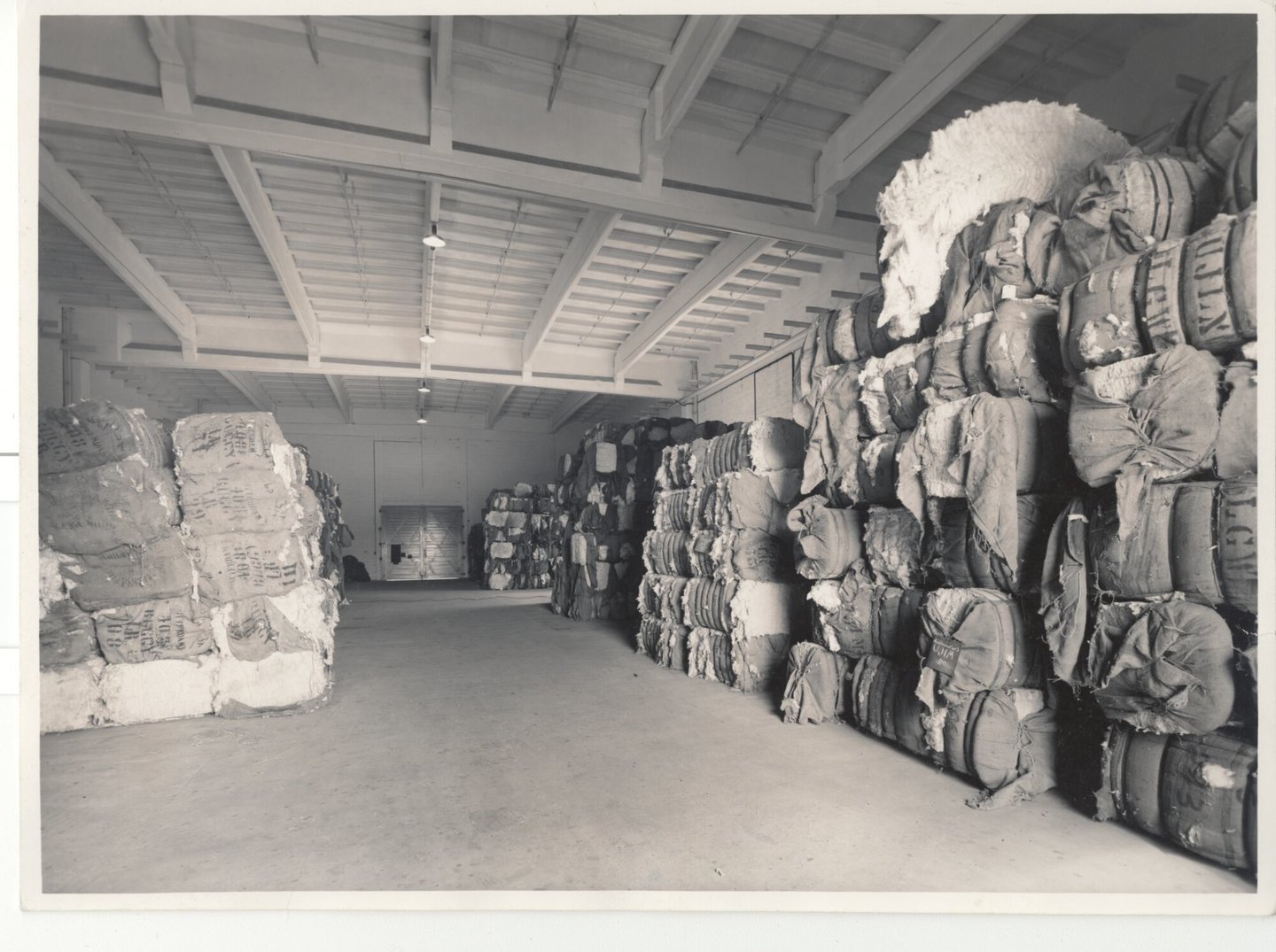 Balen ruw katoen in het balenmagazijn van textielfabriek Cotonnière E.J. Braun, gelegen in de Maïsstraat in Gent. Het balenmagazijn is een afzonderlijk gebouw waar de balen worden gestapeld. Dit magazijn staat los van de rest van de fabriek, om die gebouwen te vrijwaren in het geval van brand.