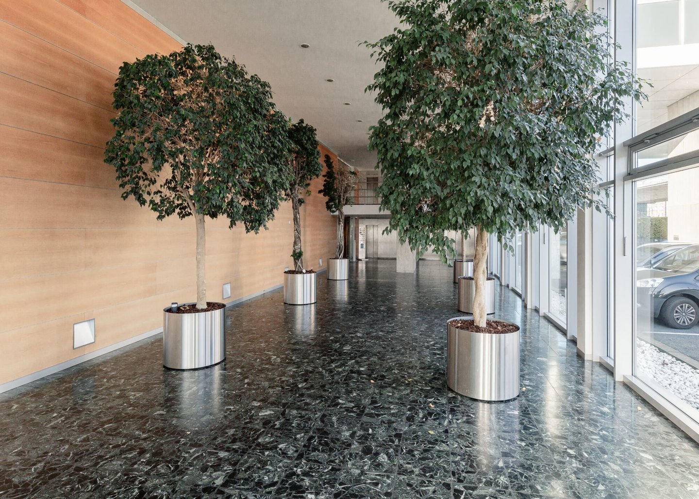 Hoofdingang van voormalig kantoorgebouw met administratief en commercieel centrum, de hoofdzetel, van het textielbedrijf UCO, gelegen aan de Bellevue in Ledeberg. Eind jaren 1950 kiest de Union Cotonnière strategisch voor Ledeberg als nieuwe administratieve uitvalsbasis. Voorzitter baron Emile Jean Braun weet dat hier enkele jaren later de op- en afritten van de autostrade zullen komen. De Duitse architect Theodor Kelter ontwerpt in modernistische stijl de eerste kantoortoren van Gent, in glas en aluminium en met veertien verdiepingen. In het gebouw waren sinds 1959 de administratie, de research-, sales- en marketingafdelingen gehuisvest, alsook verschillende expositieruimtes, conferentiezalen, een restaurant, een bar en een bibliotheek. Baron Braun beschikt over een eigen penthouse in ‘den Bellevue’. In 1991 zorgt architect Jo Crepain voor een eerste toevoeging aan het complex. Vanaf 2002 ondergaat de hele site ingrijpende wijzigingen, met onder meer de bouw van twee nieuwe torens. De UCO-toren zelf wordt behouden, mits enkele renovaties zoals de vervanging van de glazen vliesgevel. Sinds het vertrek van UCO nemen nieuwe bedrijven hun intrek in de toren. Vloer en muurbekleding deels origineel.