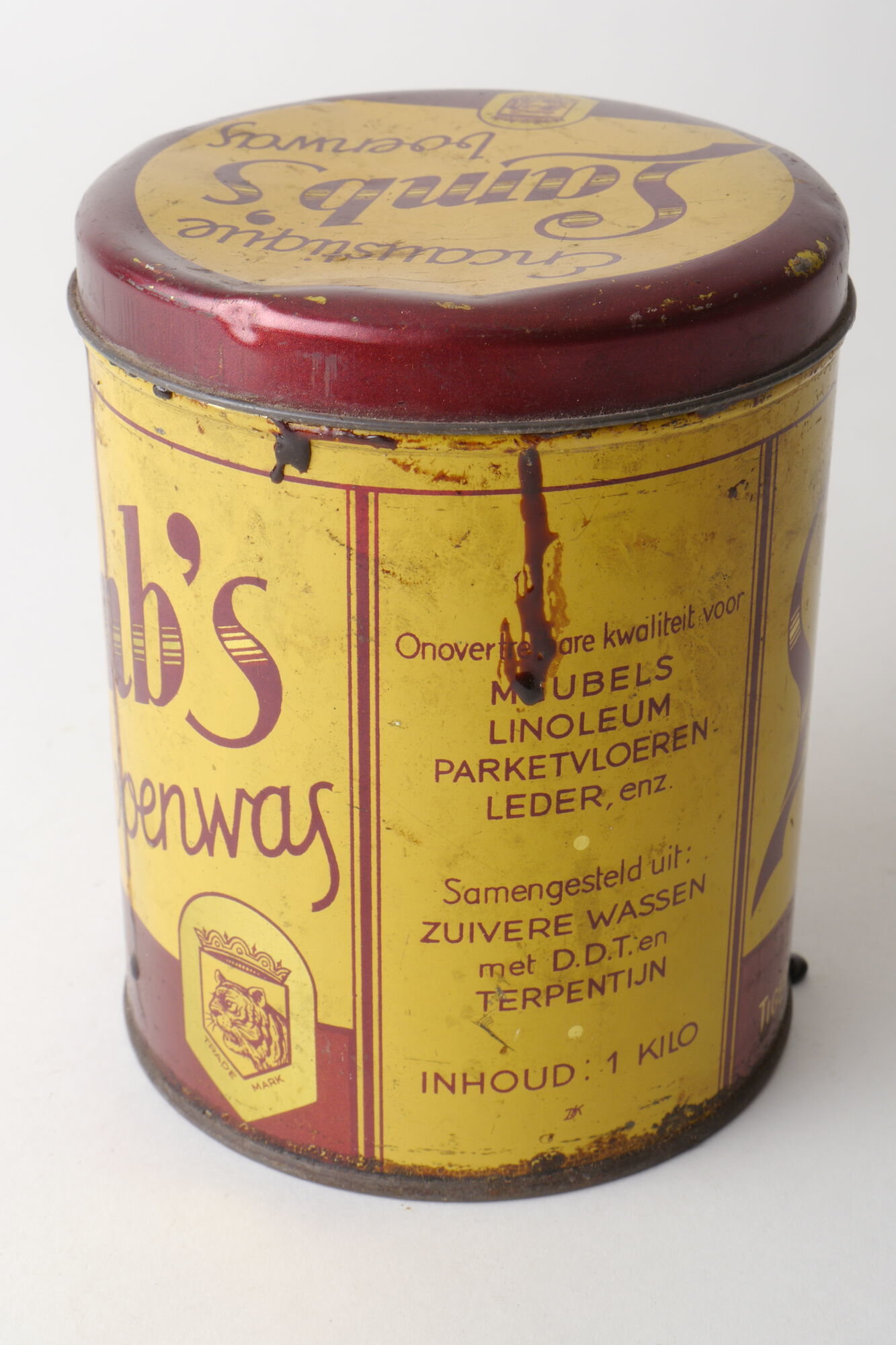 - opschriften: Lamb's / boenwas / onovertrefbare kwaliteit voor / MEUBELS / LINOLEUM / PARKETVLOEREN / LEDER, enz. / Samengesteld uit: / ZUIVERE WASSEN / met D.D.T. en / TERPENTIJN / INHOUD: 1 KILO