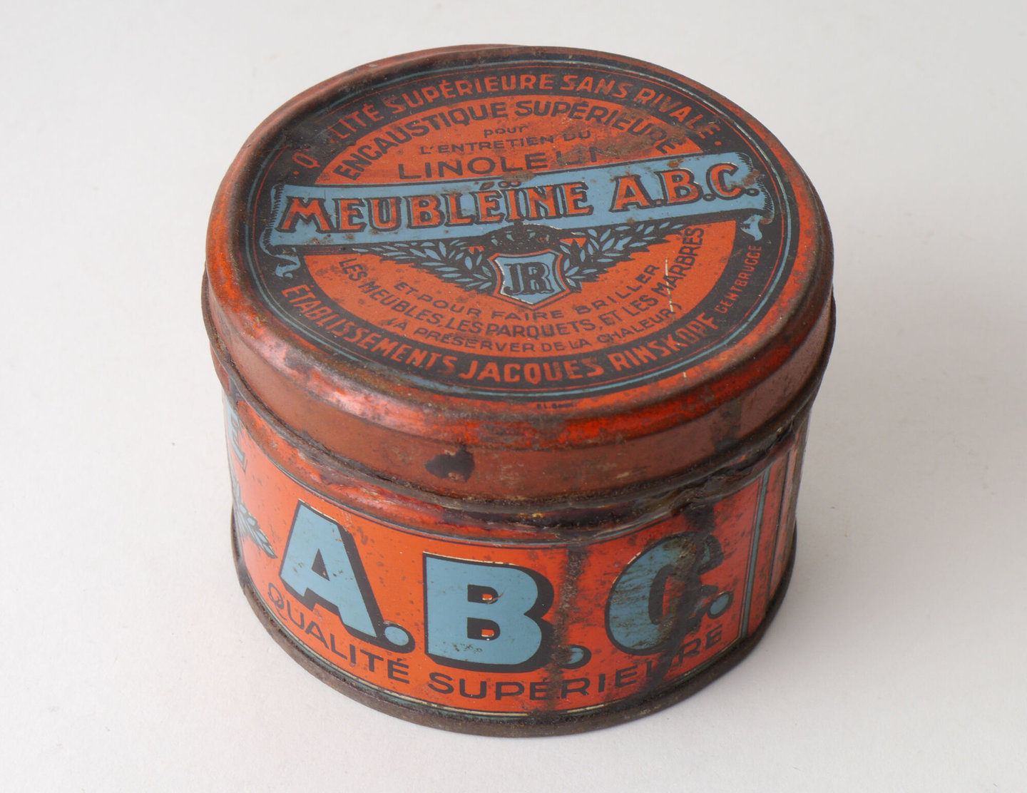 - opschriften: QUALITÉ SUPÉRIEURE SANS RIVALE. / ENCAUSTIQUE SUPÉRIEURE / POUR / L'ENTRETIEN DU / LINOLEUM / MEUBLÉÏNE A.B.C. / ET POUR FAIRE BRILLER / LES MEUBLES, LES PARQUETS, ET LES MARBRES / (LA PRÉSERVER DE LA CHALEUR) / ETABLISSEMENTS JACQUES RINSKOPF GENTBRUGGE