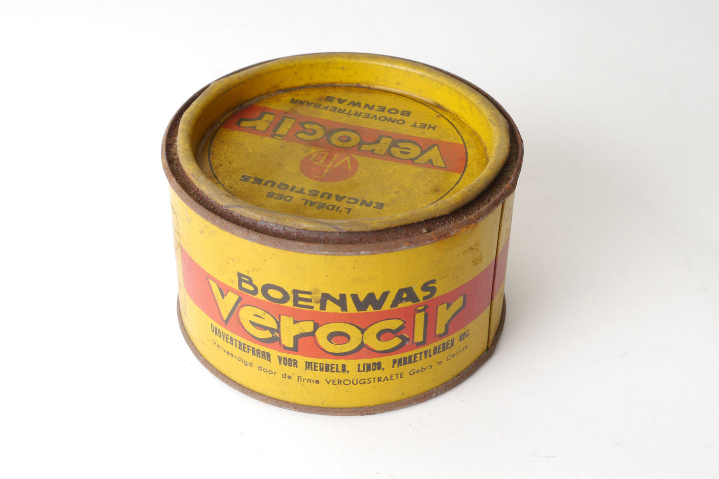 - opschriften: BOENWAS / verocir / ONOVERTREFBAAR VOOR MEUBELS, LINOS, PARKETVLOEREN, ENZ.// VFD / verocir / HET ONOVERTREFBAAR BOENWAS