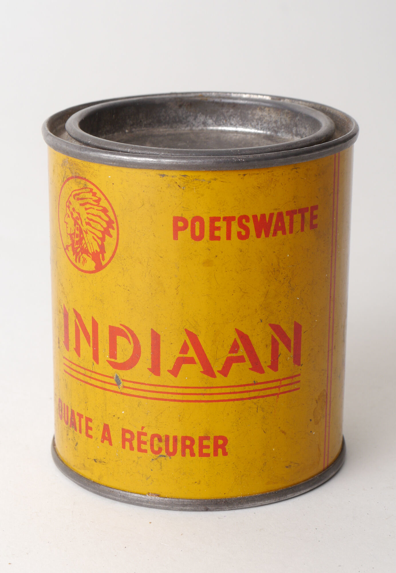 - opschriften: POETSWATTE / INDIAAN Indiaan // GEBRUISWIJZE / Neem een propje watte uit de doos en het te poetsen voorwerp mede inwrijven / daarna met een droge / zachte doek goed opblinken. Doos / goed sluiten.