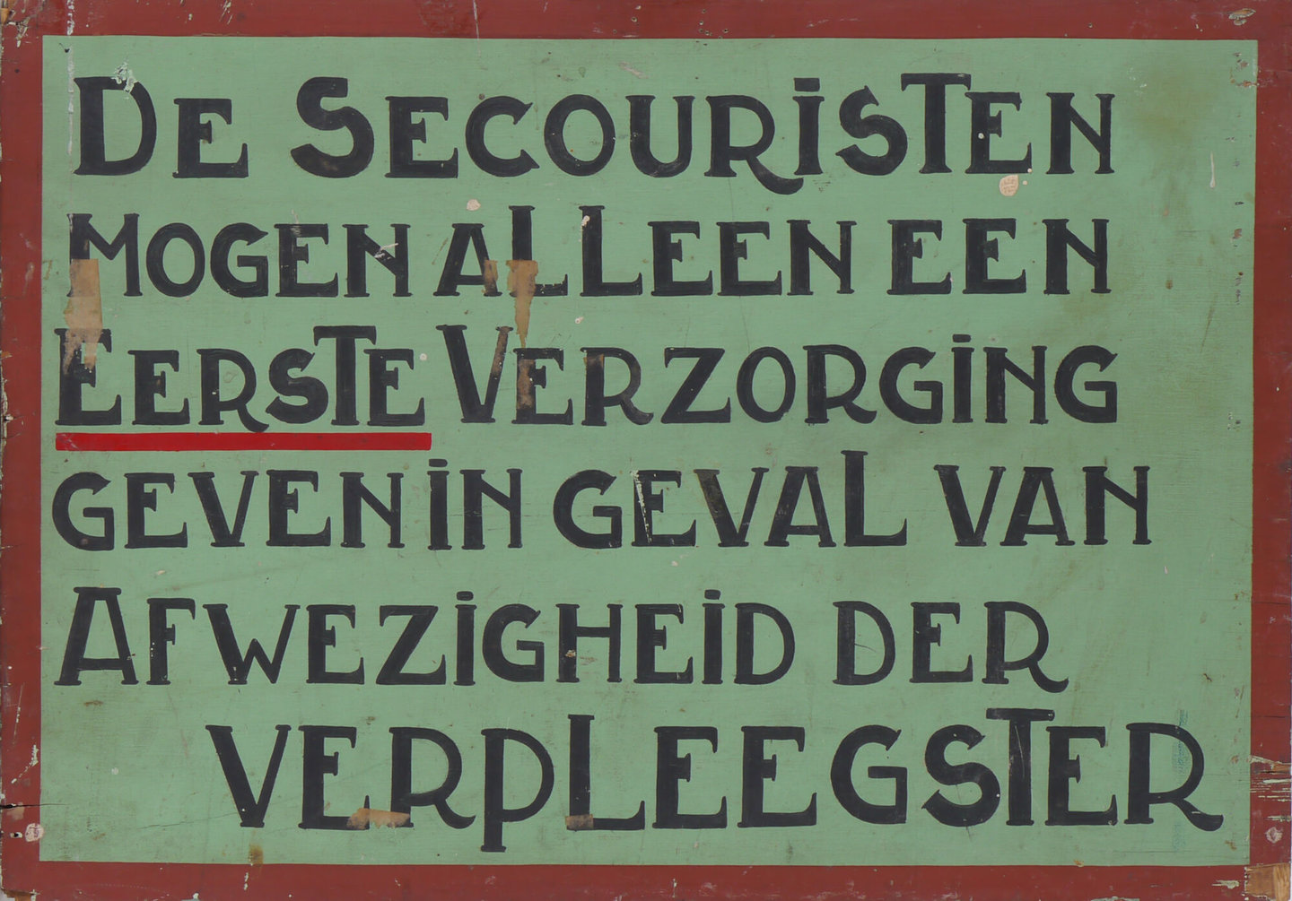 - opschriften: DE SECOURISTEN MOGEN ALLEEN EEN EERSTE VERZORGING GEVEN IN GEVAL VAN AFWEZIGHEID DER VERPLEEGSTER