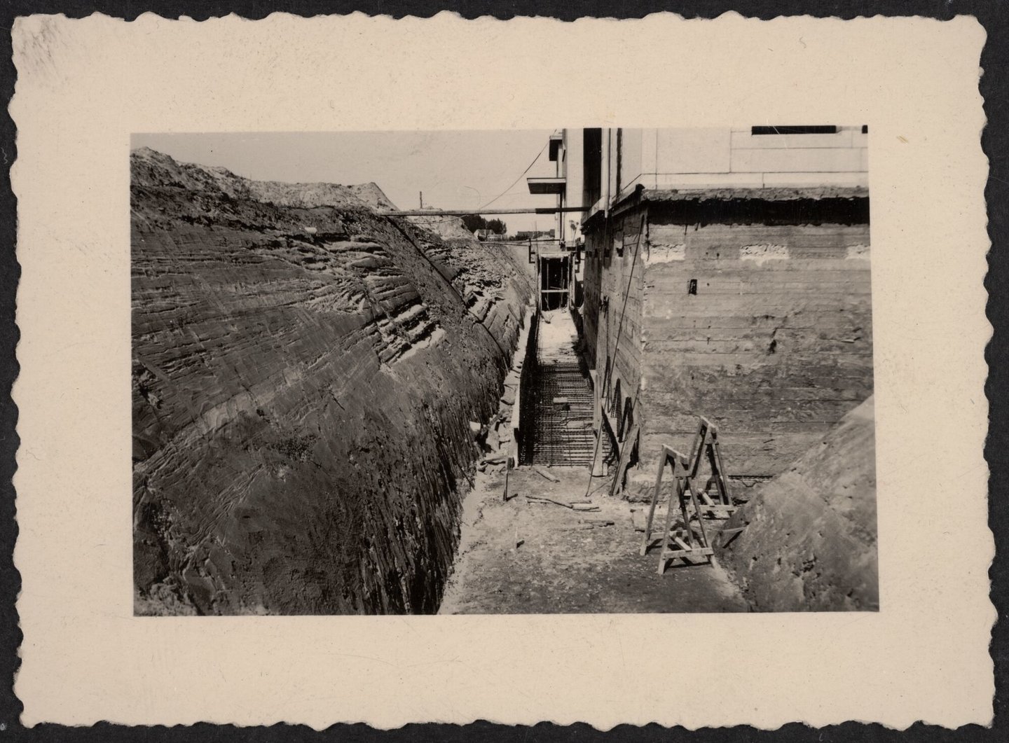Zicht op de bouwwerf van het Academisch Ziekenhuis, nu Universitair Ziekenhuis, gelegen aan Corneel Heymanslaan 10 in Gent. Het gebouw is door bouwfirma Serck nv opgetrokken.
