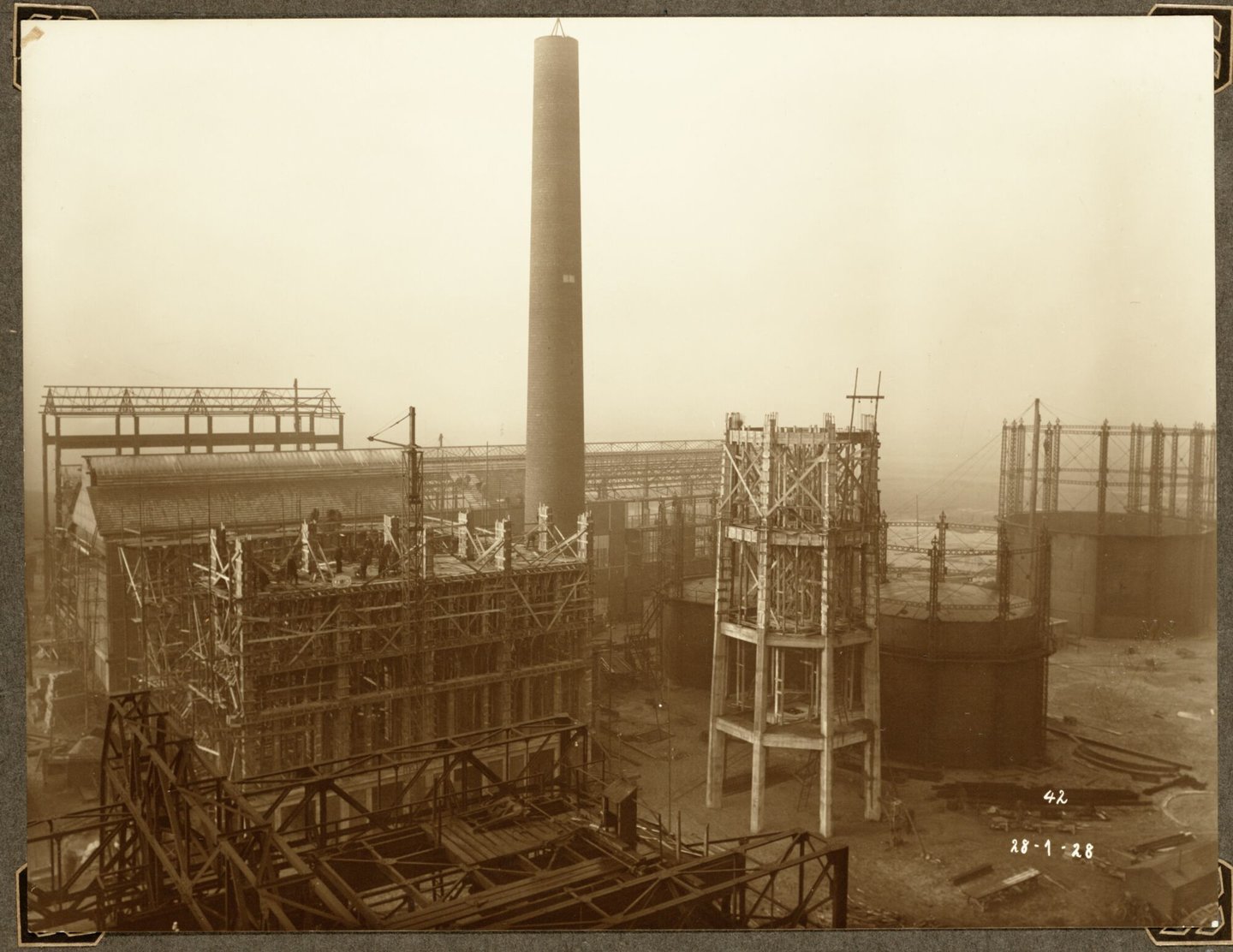 #fotopapier #gas #gasdistributie #gashouder #2de kwart 20ste eeuw #chemie #industriële architectuur #bouw #fabriek #Serck nv #bouwterrein #schoorsteen #Zelzate #cokesfabriek #Kuhlmann #ammoniakfabriek #Babcock & Wilcox #watertoren