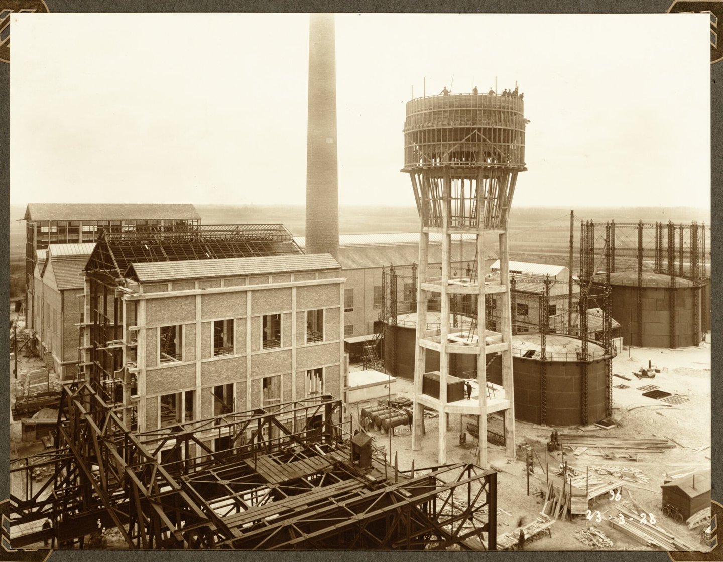 #fotopapier #gas #gasdistributie #gashouder #2de kwart 20ste eeuw #reclamebord #chemie #industriële architectuur #bouw #fabriek #Serck nv #bouwterrein #schoorsteen #Zelzate #cokesfabriek #Kuhlmann #ammoniakfabriek #Babcock & Wilcox #watertoren