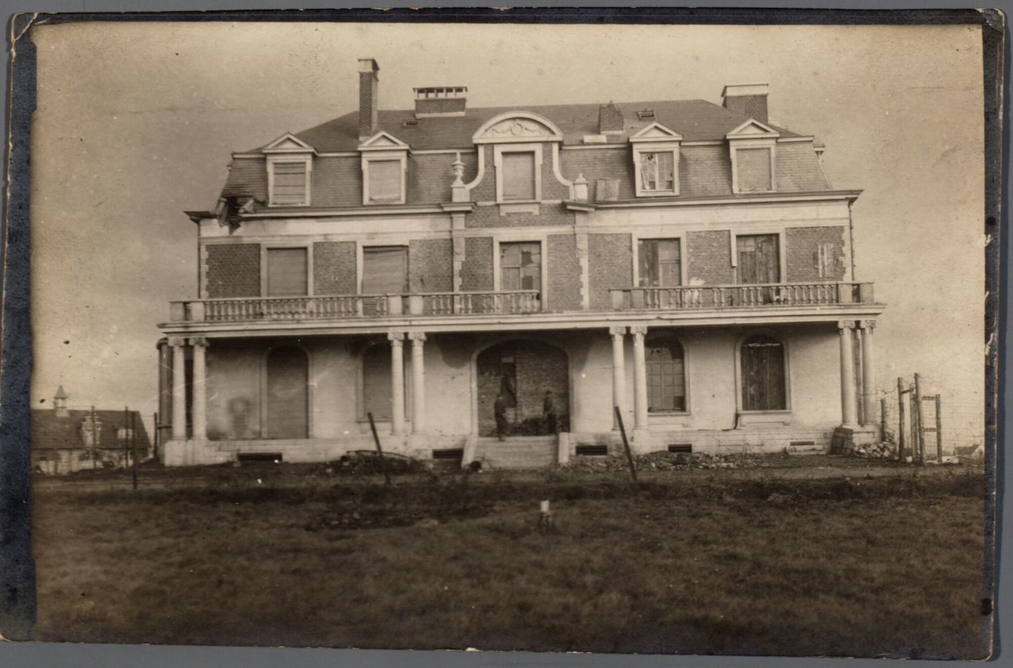 Zicht op de bouwwerf van het kasteel Wallemote, gelegen in de Kokelarestraat 85 in Izegem. De werken zijn uitgevoerd door bouwfirma Serck nv. Centraal zijn twee werknemers te zien. Het landhuis is eigendom van Gaspard Vanden Bogaerde, zoon van Izegems burgemeester Valère Vanden Bogaerde. Op hetzelfde terrein staat ook kasteel Wolvenhof, dat tegelijkertijd gebouwd is en eigendom is van zijn broer Emile.