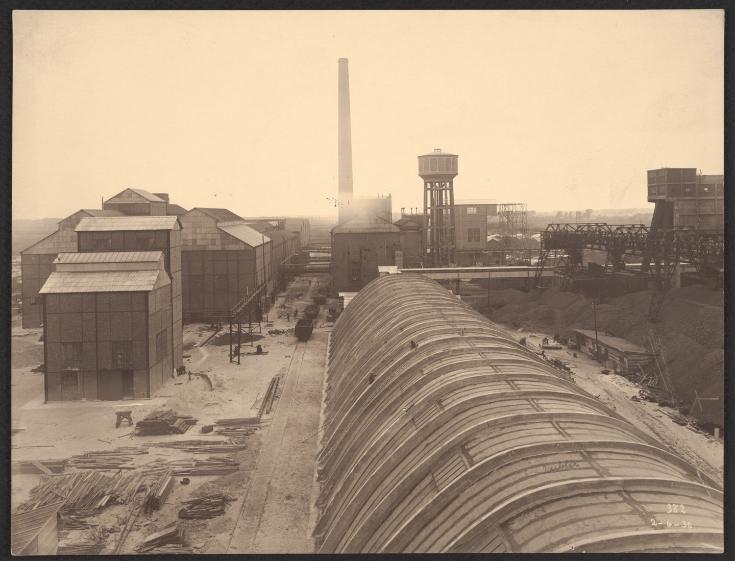 #fotopapier #gashouder #2de kwart 20ste eeuw #chemie #industriële architectuur #magazijn #bouw #fabriek #Serck nv #bouwterrein #spoorlijn #schoorsteen #Zelzate #cokesfabriek #Kuhlmann #watertoren
