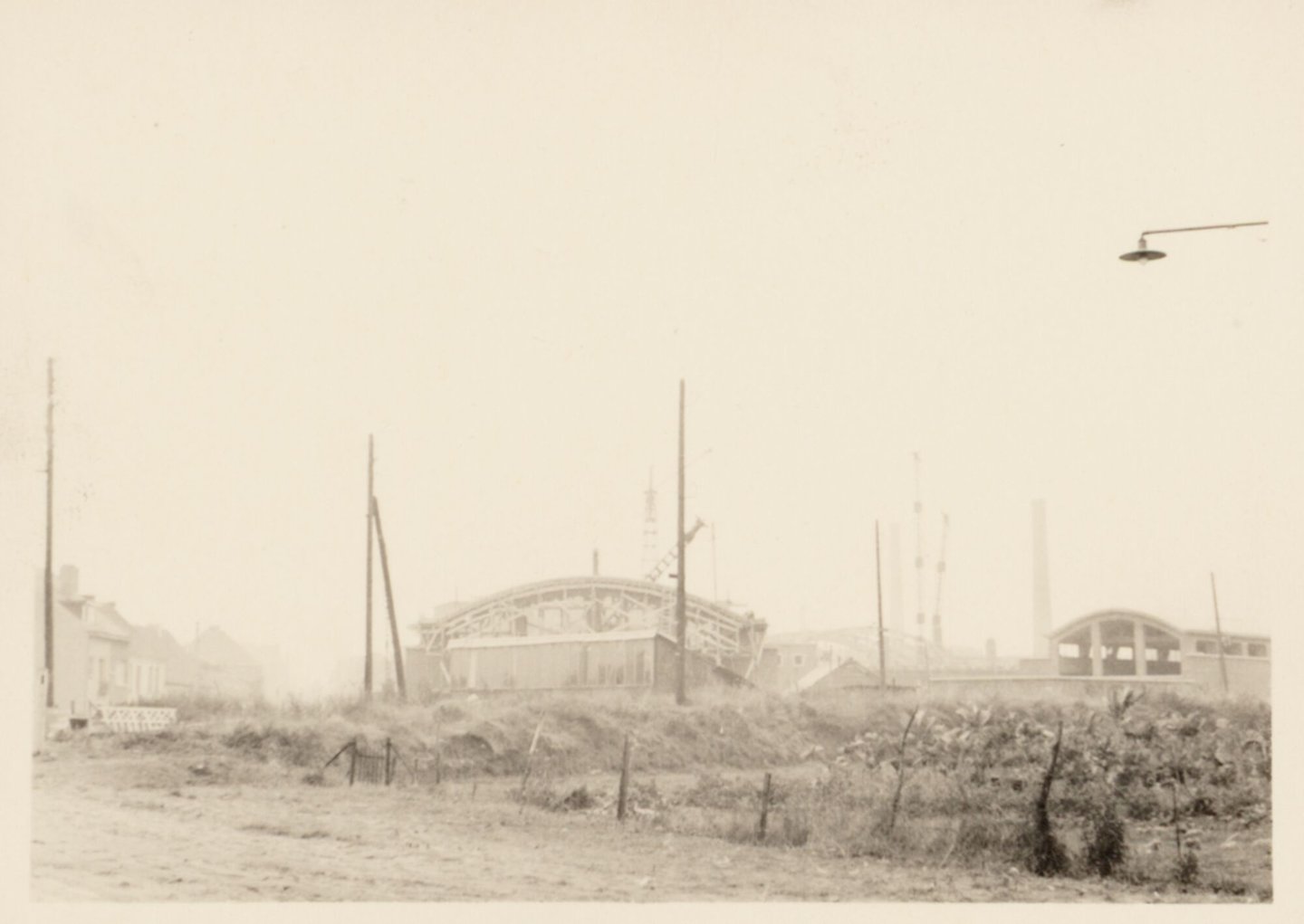 Zicht op de bouwwerf van de lokalen voor de dienst Stadsreiniging, gelegen aan de Palinghuizen in Gent. De site is door bouwbedrijf Serck nv opgetrokken.