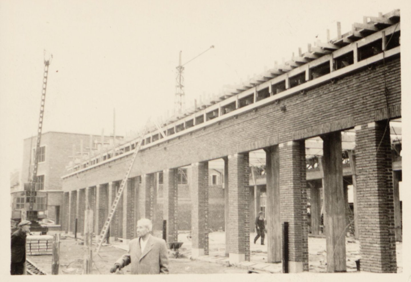 Zicht op de bouwwerf van de lokalen voor de dienst Stadsreiniging, gelegen aan de Palinghuizen in Gent. De site is door bouwbedrijf Serck nv opgetrokken.