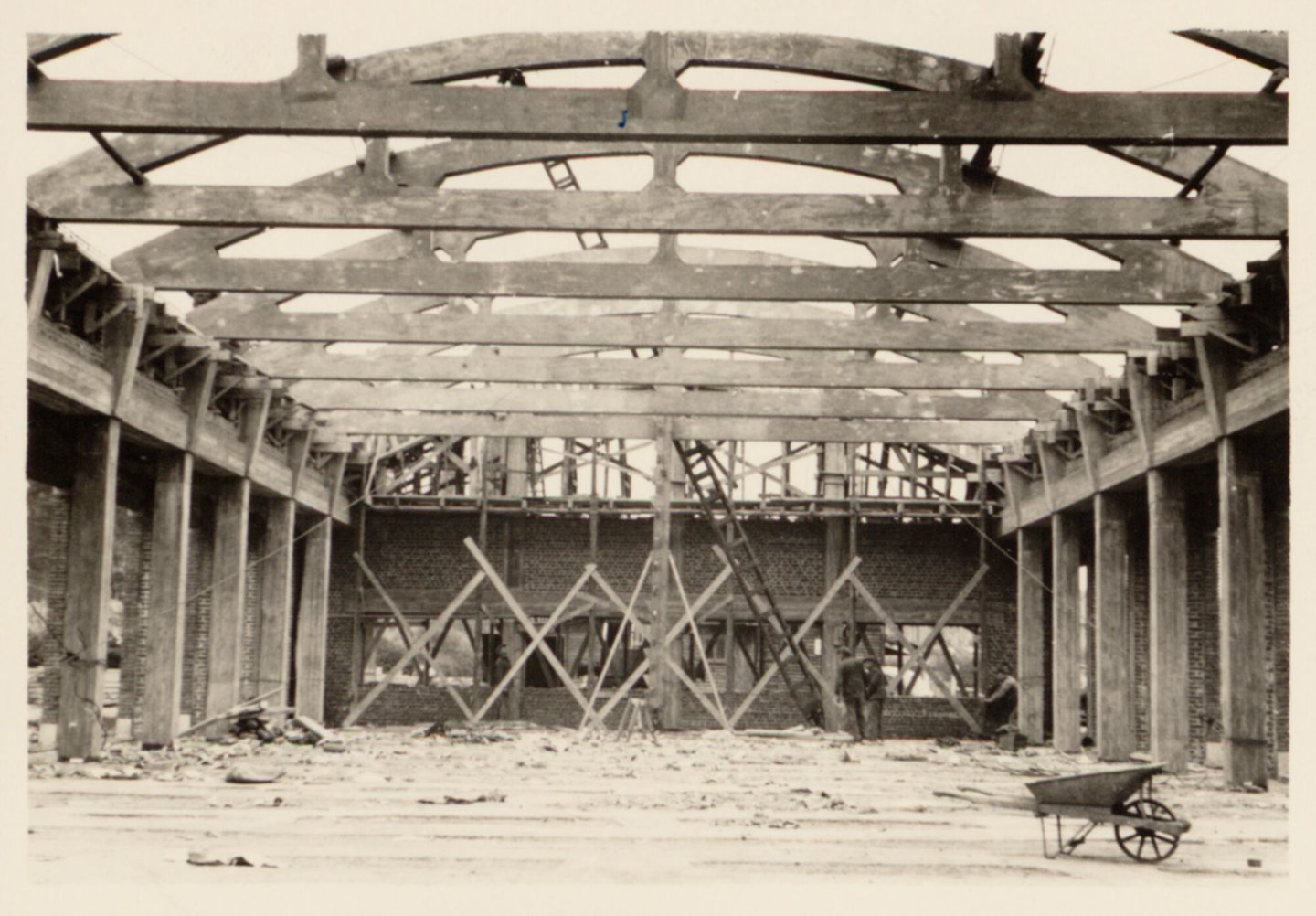 Zicht op de bouwwerf van de lokalen voor de dienst Stadsreiniging, gelegen aan de Palinghuizen in Gent. De site is door bouwbedrijf Serck nv opgetrokken.