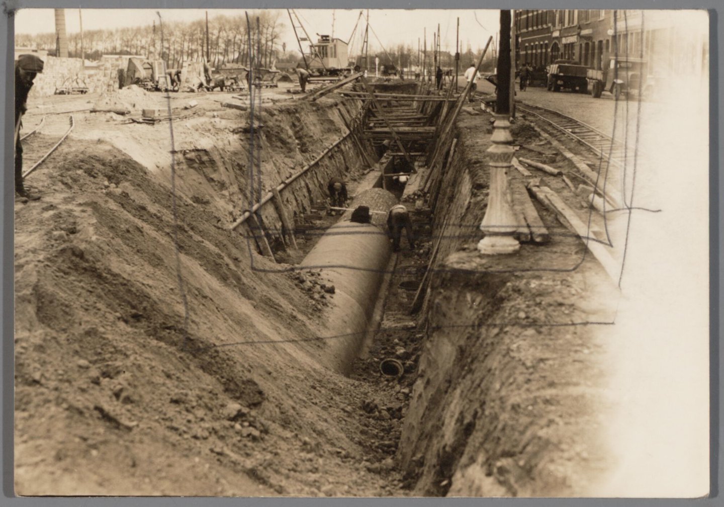Zicht op de bouwwerf van een riolering, gelegen aan de Vliegtuiglaan in Gent. De werken zijn door bouwfirma Serck uitgevoerd. Diverse werknemers van het bedrijf zijn aan het werk.