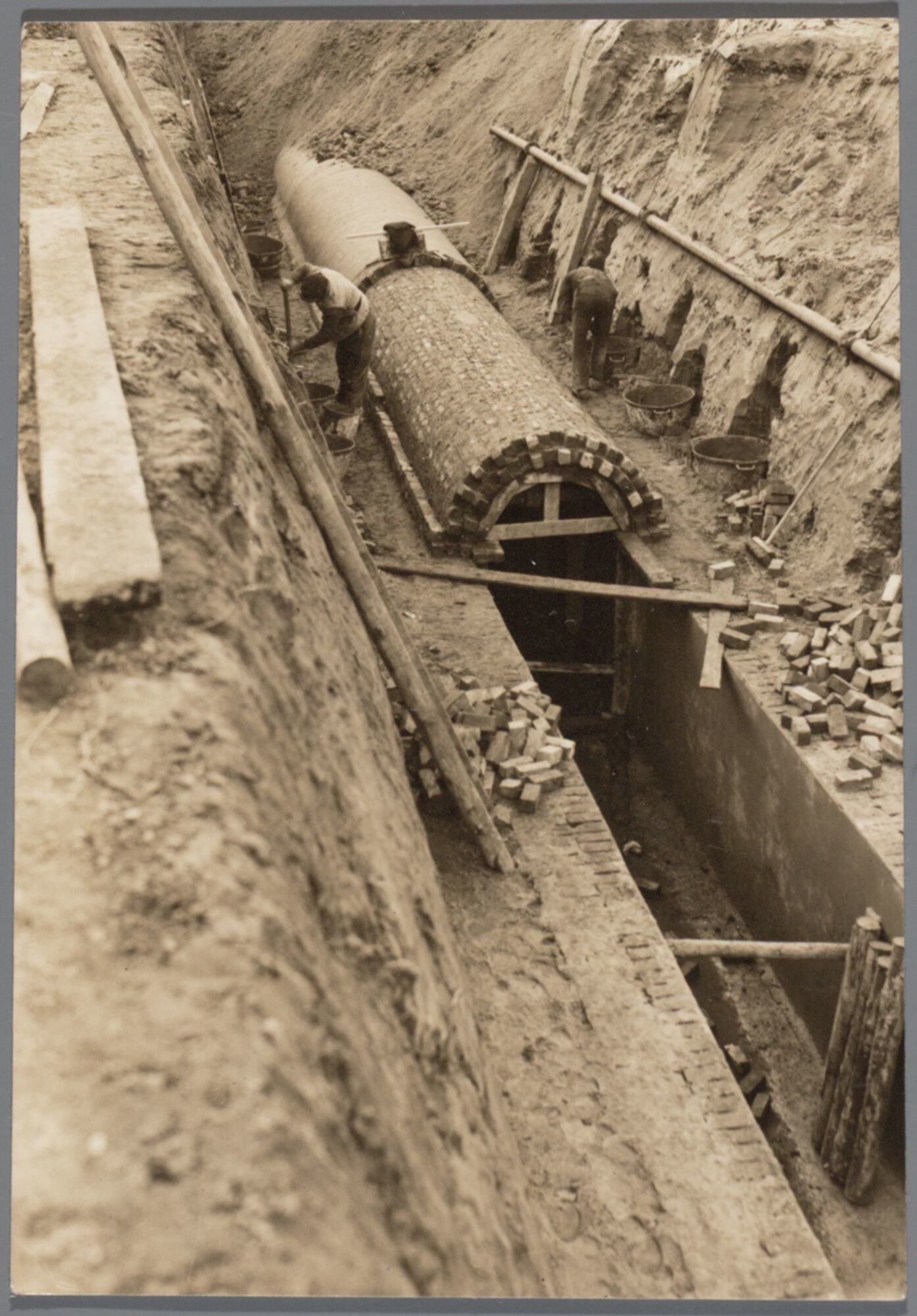 Zicht op de bouwwerf van een riolering, gelegen aan de Vliegtuiglaan in Gent. De werken zijn door bouwfirma Serck uitgevoerd. Twee arbeiders van het bedrijf zijn aan het werk.