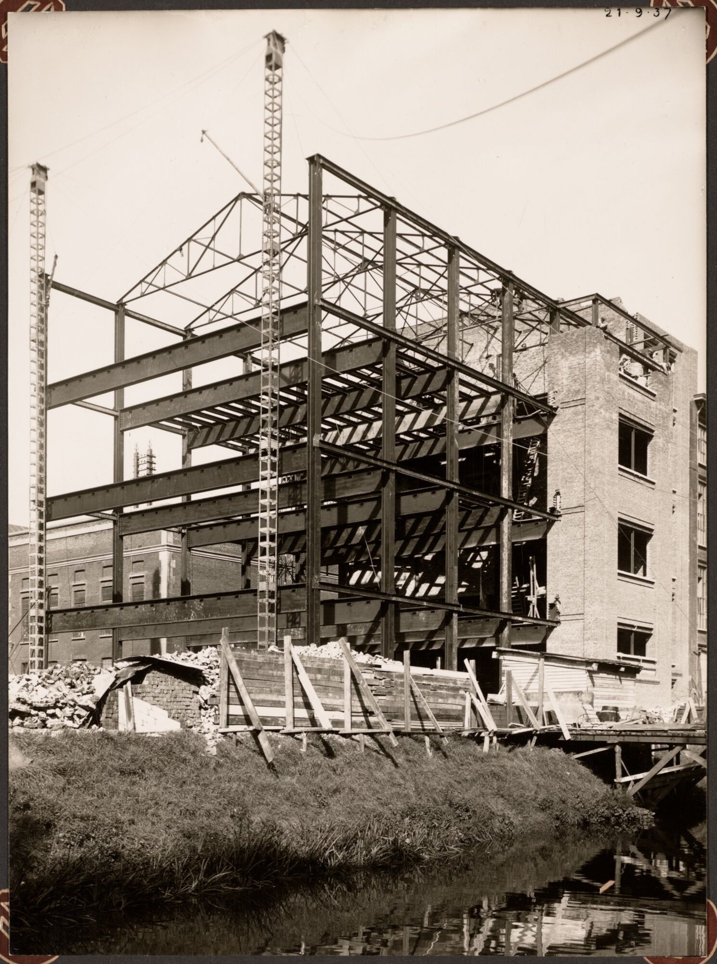 #Gent #fotopapier #textielfabriek #textiel #2de kwart 20ste eeuw #spinnen #vlas #staal #spinnerij #Vlasspinnerij #La Lys nv #kraan #industriële architectuur #Brugse Poort - Rooigem #bouw #fabriek #Serck nv #bouwterrein