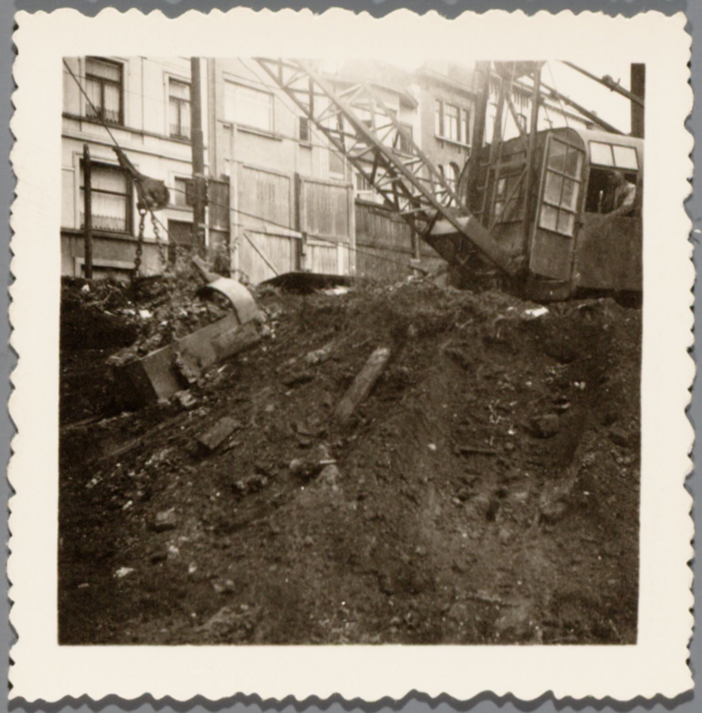 Zicht op de bouwwerf van textielfabriek Textile-Déchets, gelegen in de Kongostraat en Nieuwland in Gent. De site is door bouwbedrijf Serck nv opgetrokken. Op de foto is een bouwkraan te zien. In 1961 verhuist de fabriek naar de Wiedauwkaai in Gent, waar het de bedrijfsgebouwen van vlasspinnerij La Liève nv inneemt.