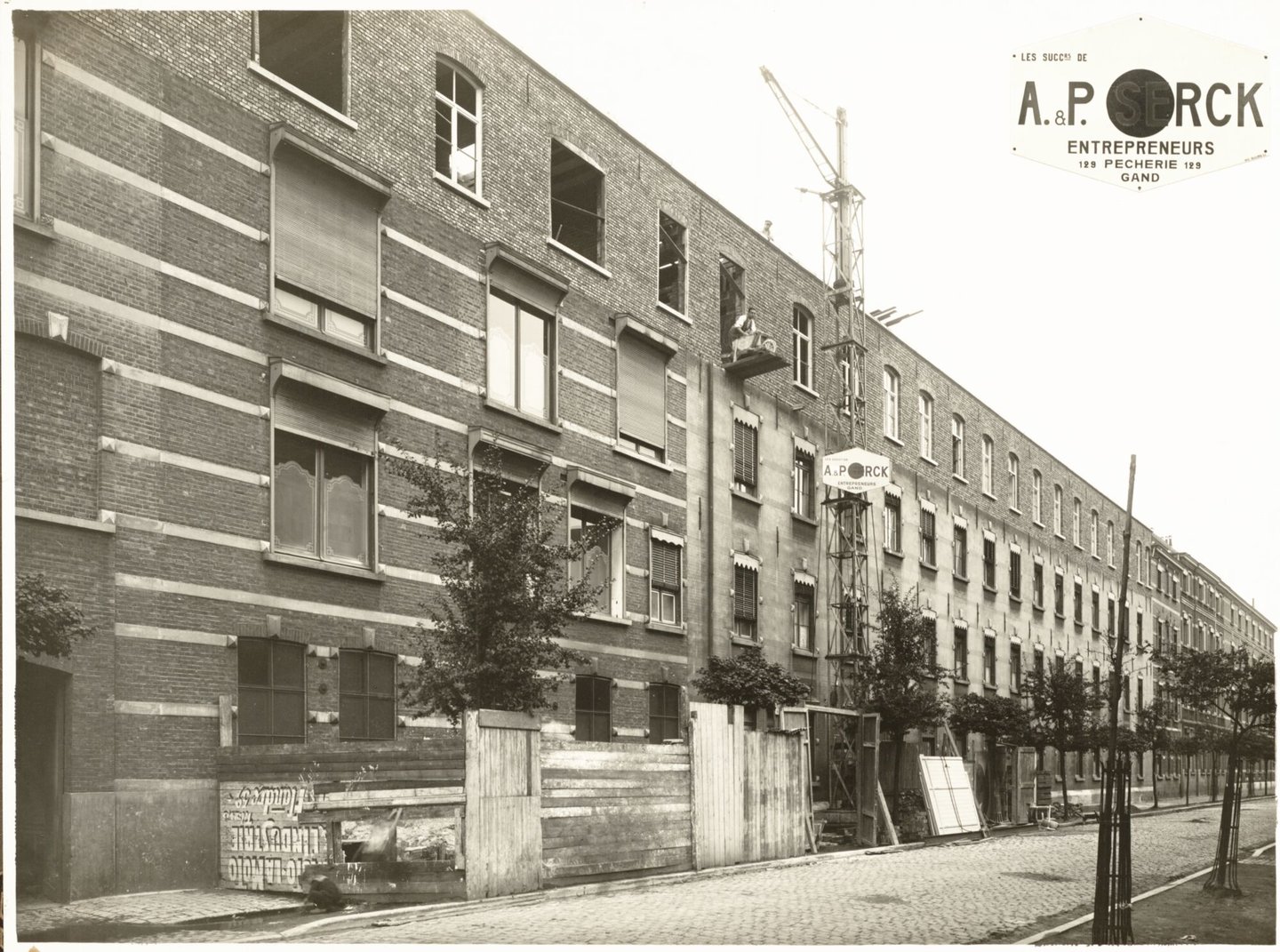 - opschriften: LES SUCCrs DE A. & P. SERCK ENTREPRENEURS 129 PECHERIE 129 GAND PHOTOGRAPHIE Charles DE WILDE Rue de Bruges - 91 - Burgstraat GAND - GENT