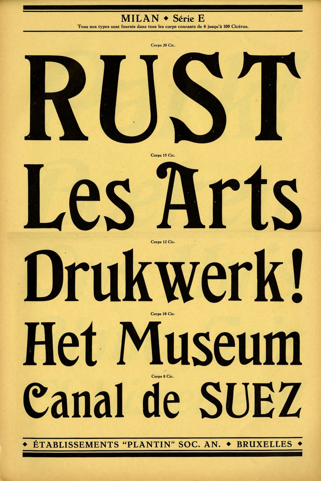 Pagina uit een letterproef met houten letters en ornamenten van de Brusselse firma Établissements Plantin, ca. 1920. Collectie Industriemuseum