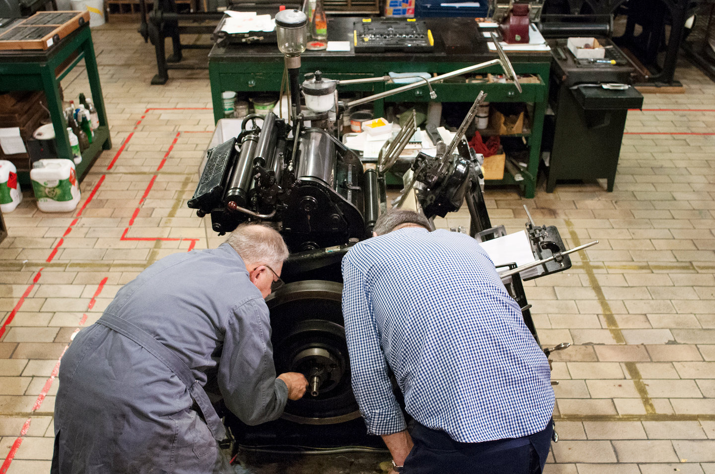 Vrijwilligers bekijken een technisch probleem met de Heidelberg pers tijdens Museumnacht 2017. De aard van de collectie vraagt veel technische kennis voor het behoud en beheer ervan. Foto: Joris Vandecatseye, collectie Industriemuseum