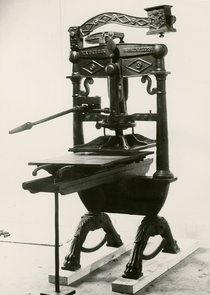 De gietijzeren Albion pers van Brussels constructeur Mathieu in de tentoonstelling In-druk-ken, 1989. Deze unieke en waardevolle pers dateert van 1827-1830. Foto collectie Industriemuseum