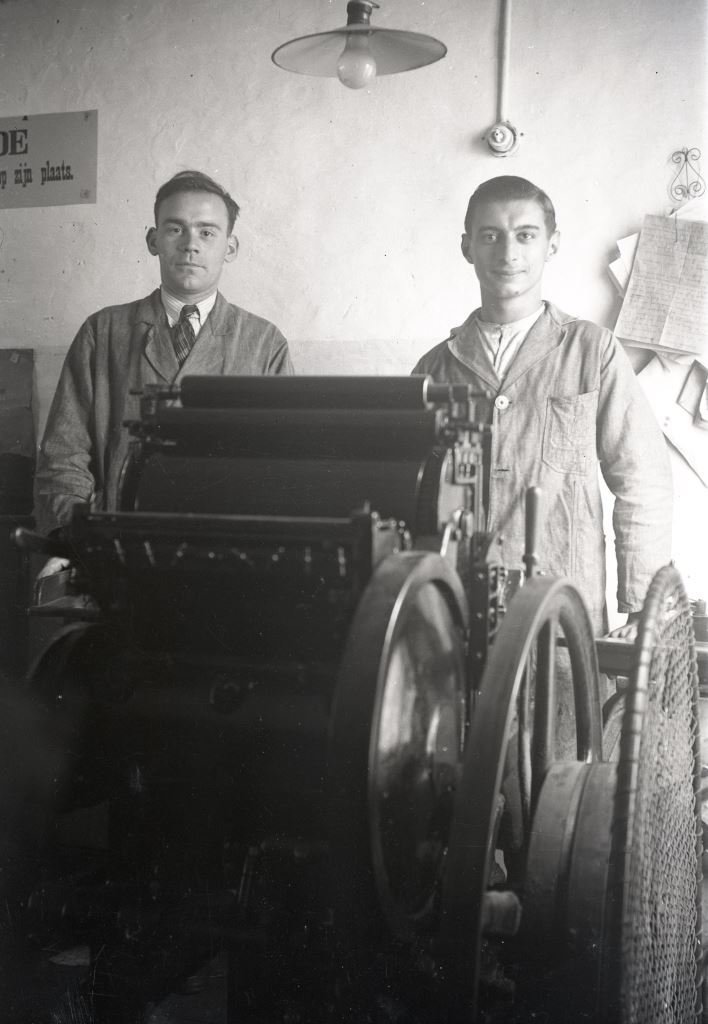 Drukker Walter Strobbe en zijn helper in drukkerij Strobbe, Gent, 1944. De familie Strobbe schonk naar aanleiding van de beeldoproep niet alleen foto’s maar ook drukwerk en enkele objecten aan de collectie. Collectie Industriemuseum.