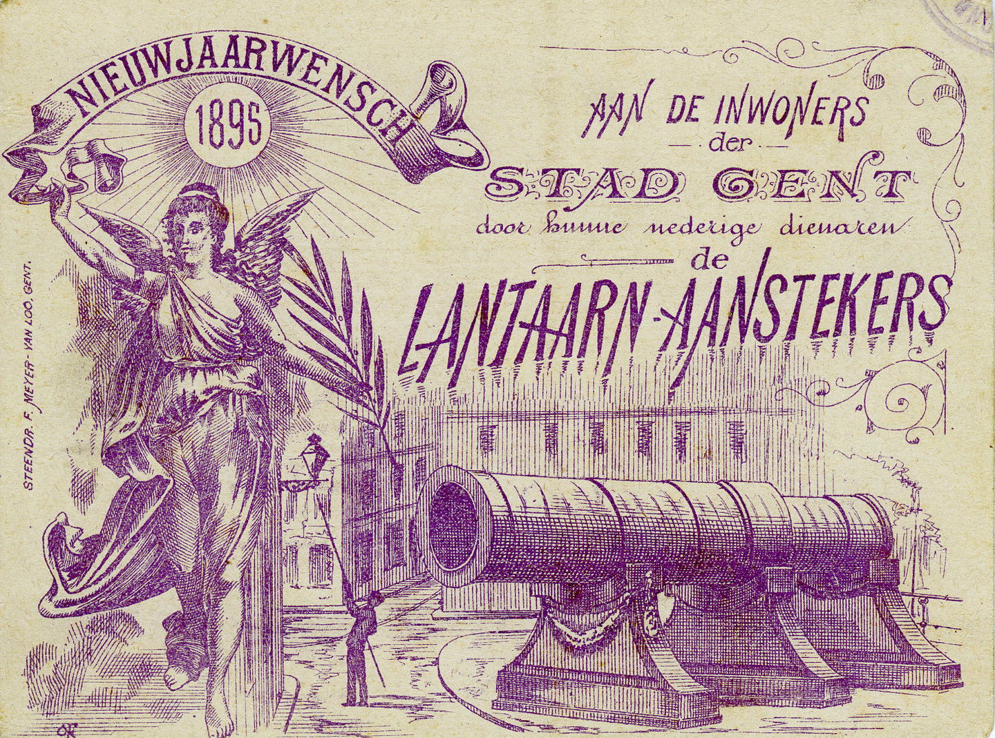 De lantaarnaanstekers, tondeliers genoemd, maken er een traditie van om hun nieuwjaarswensen jaarlijks uit te spreken. Nieuwjaarskaart uit 1895. Collectie Huis van Alijn, 1986-028-008.