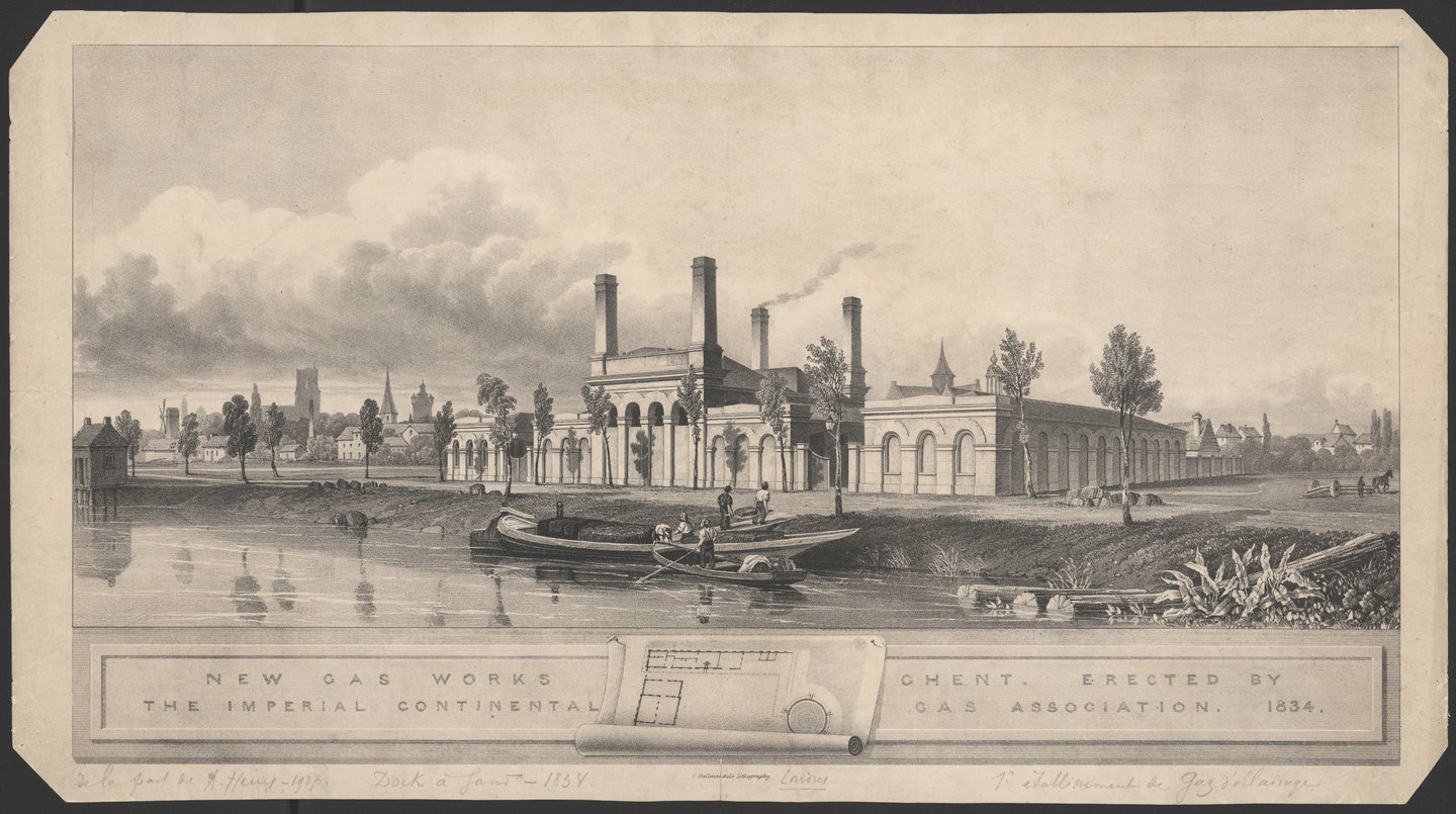 Zicht op de gasfabriek aan het Handelsdok. Lithografie, 1834. Collectie Archief Gent, IC_AG_L_158_040