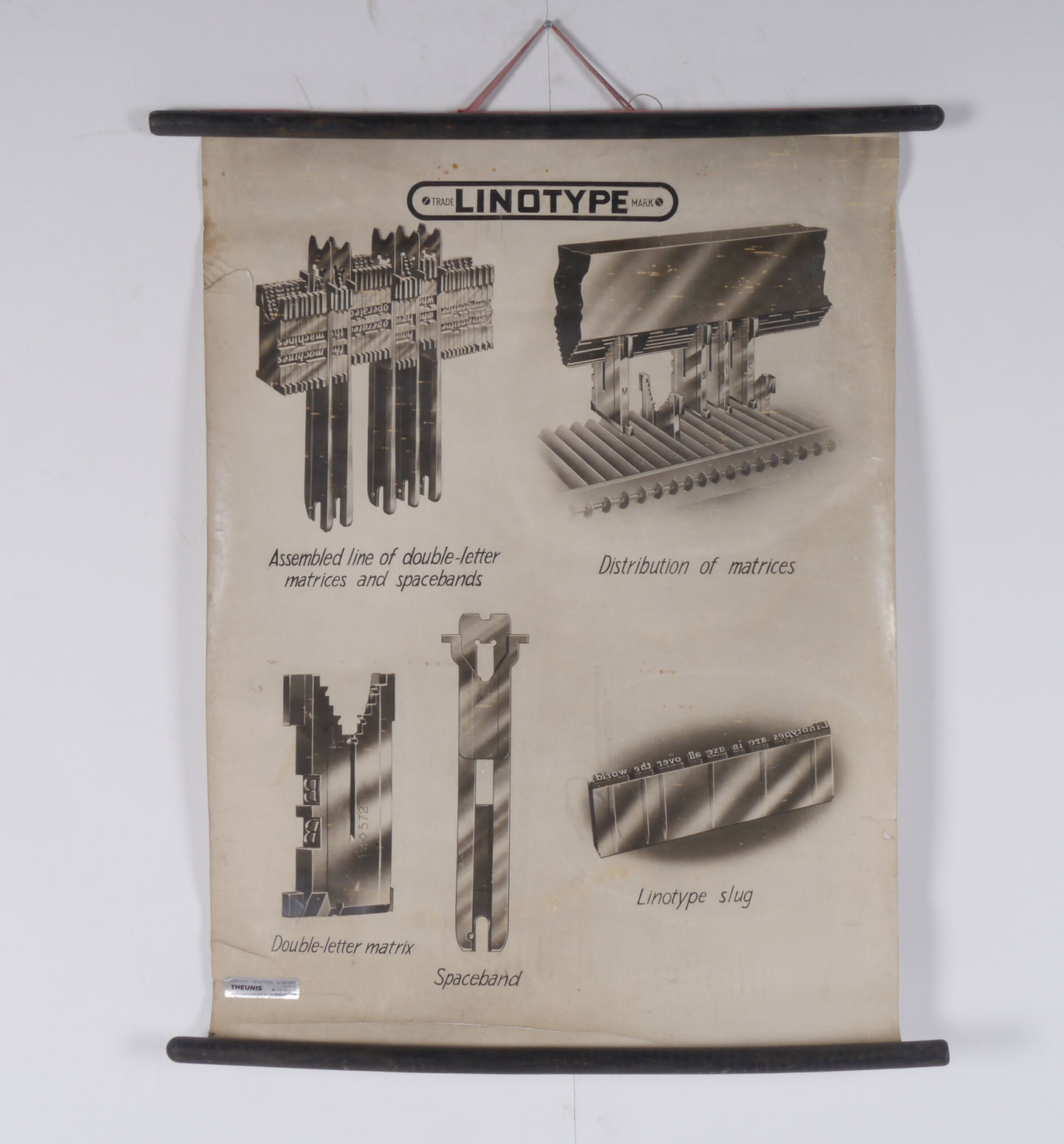 - opschriften: TRADE LINOTYPE MARK / Aembled line of double-letter matrice and spacebands / Distribution of matrices / Double-letter matrix / spaceband / Linotype slug
