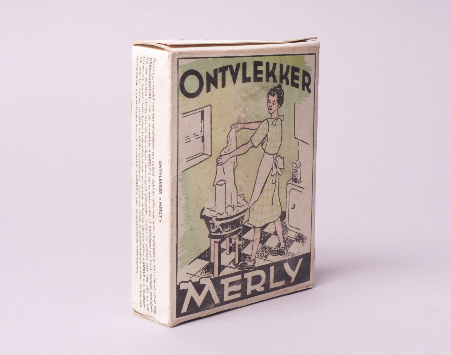 - opschriften: ONTVLEKKER "MERLY" / Onfeilbaar middel voor het verwijderen van allerlei vlekken zelfs zeer oude: bijzonderlijk inkt - bloed - fruit enz. / GEBRUIKSWIJZE: Los de ontvlekker "MERLY" op in warm (1 koffielepel per liter). Dompel onmiddelijk het bevlekte linn