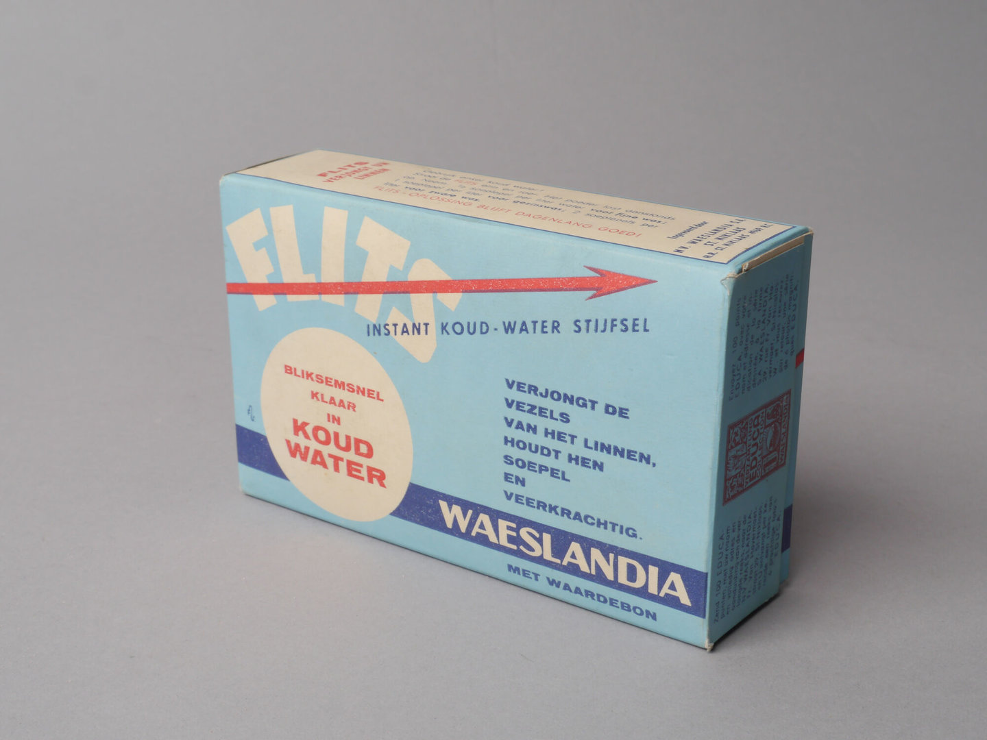 - opschriften: FLITS / INSTANT KOUD-WATER STIJFSEL / BLIKSEMSNEL / KLAAR / IN / KOUD / WATER / VERJONGT DE / VEZELS / VAN HET LINNEN, / HOUDT HEN / SOEPEL / EN / VEERKRACHTIG. / WAESLANDIA / MET WAARDEBON // FLITS / NET / 150 GR. / KOUD-WATER STIJFSEL / AMIDON A L'EAU F