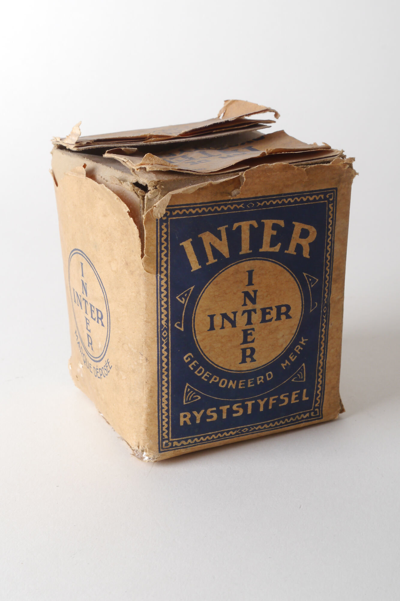 - opschriften: INTER / GEDEPONEERD MERK / RYSTSTYFSEL // GEWICHT / 250 Gr. / AMIDON DE RIZ / INTER / RYSTSTYFSEL / SPECIAAL TE ANTWERPEN / INGEPAKT