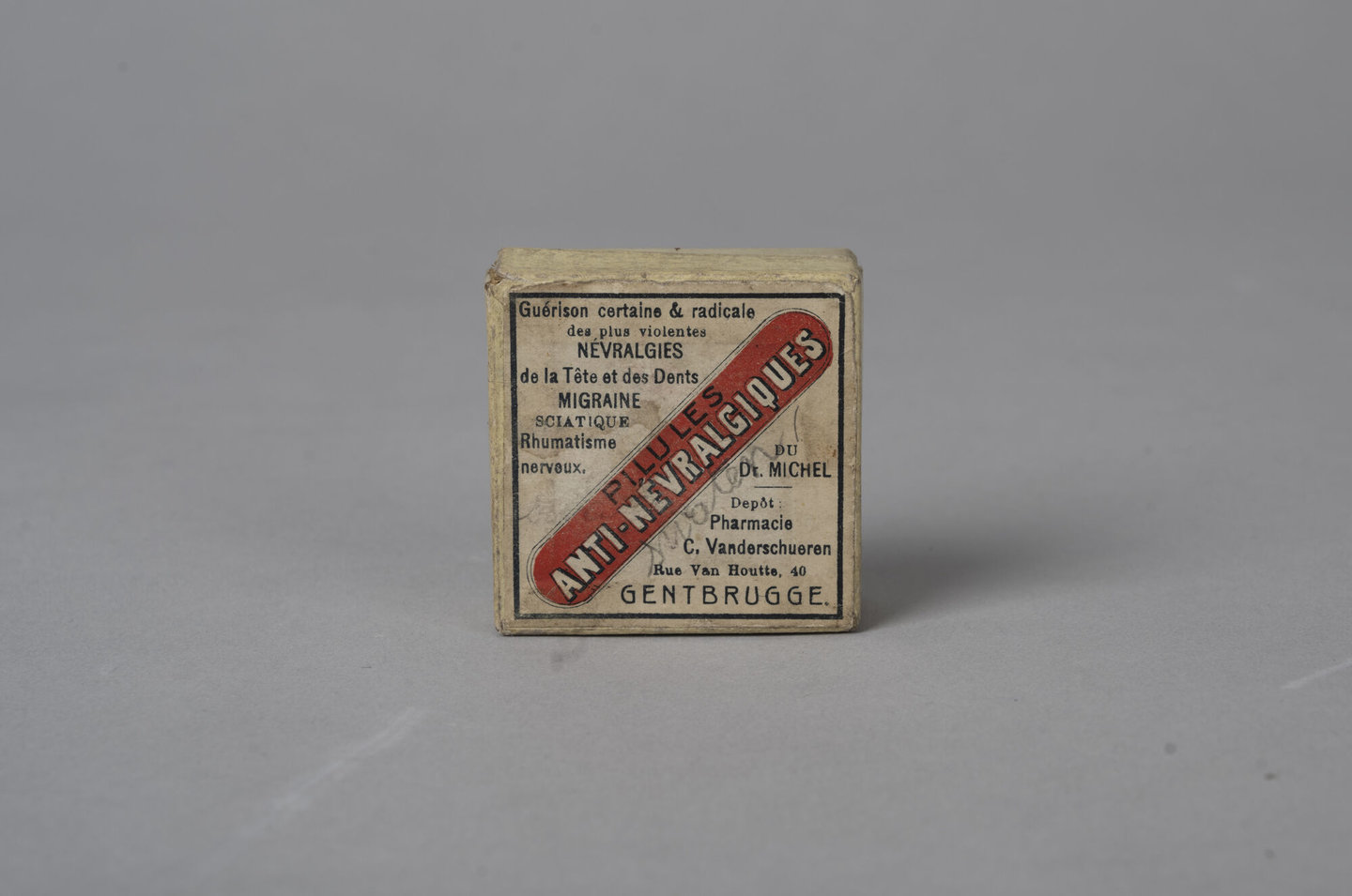 - opschriften: Guérison certaine & radicale des plus violantes NEVRALGIES de la Tête et des Dents / MIGRAINE / SCIATIQUE / Rhumatisme nerveux / PILULES ANTI-NÉVRALIGIQUES / Du Dr. MICHEL / Depôt: Pharmacie C. Vanderschueren / Rue Van Houtte 40 / GENTBRUGGE