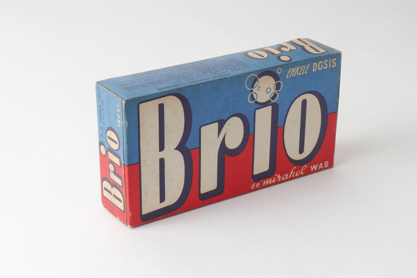 - opschriften: ENKELE DOSIS / BRIO / de "mirakel" WAS // Brio / N. V. TENSIA LUIK / H. R. LK: 67.781 / 150 Gr. // Brio / NIEUW GECONCENTREERD PRODUCT / Deze doos volstaat voor 3 tot 4 emmers water. / WIT GOED: WASSEN ZOALS NAAR GEWOONTE - NIETS ANDERS BIJ GEBRUIKEN - BR