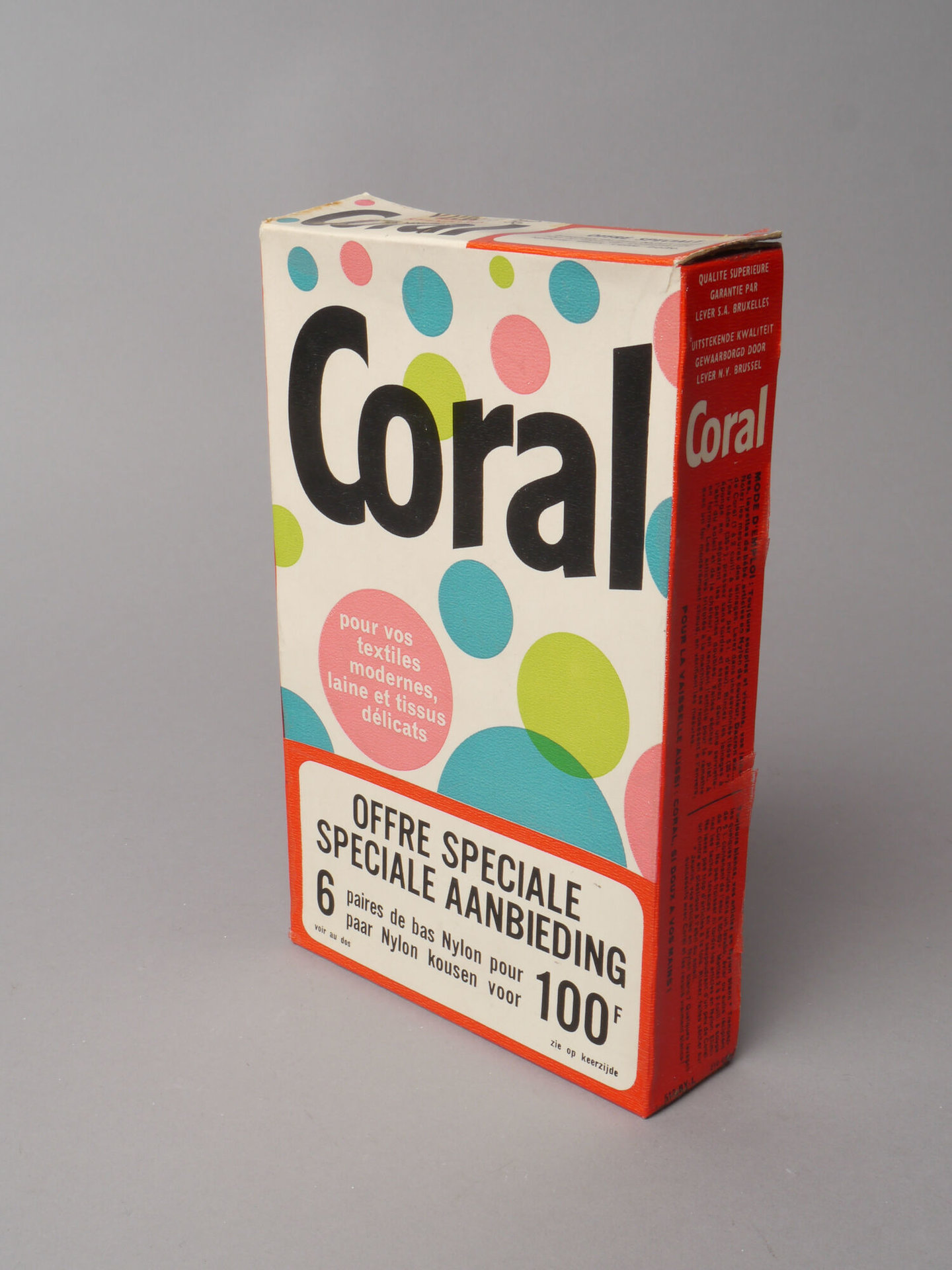 - opschriften: Coral / pour textiles modernes, laine et tissus délicats / SPECIALE AANBIEDING / 6 paar Nylon kousen voor 100 F // ... Coral het ultra-moderne wasmiddel voor alle moderne weefsels