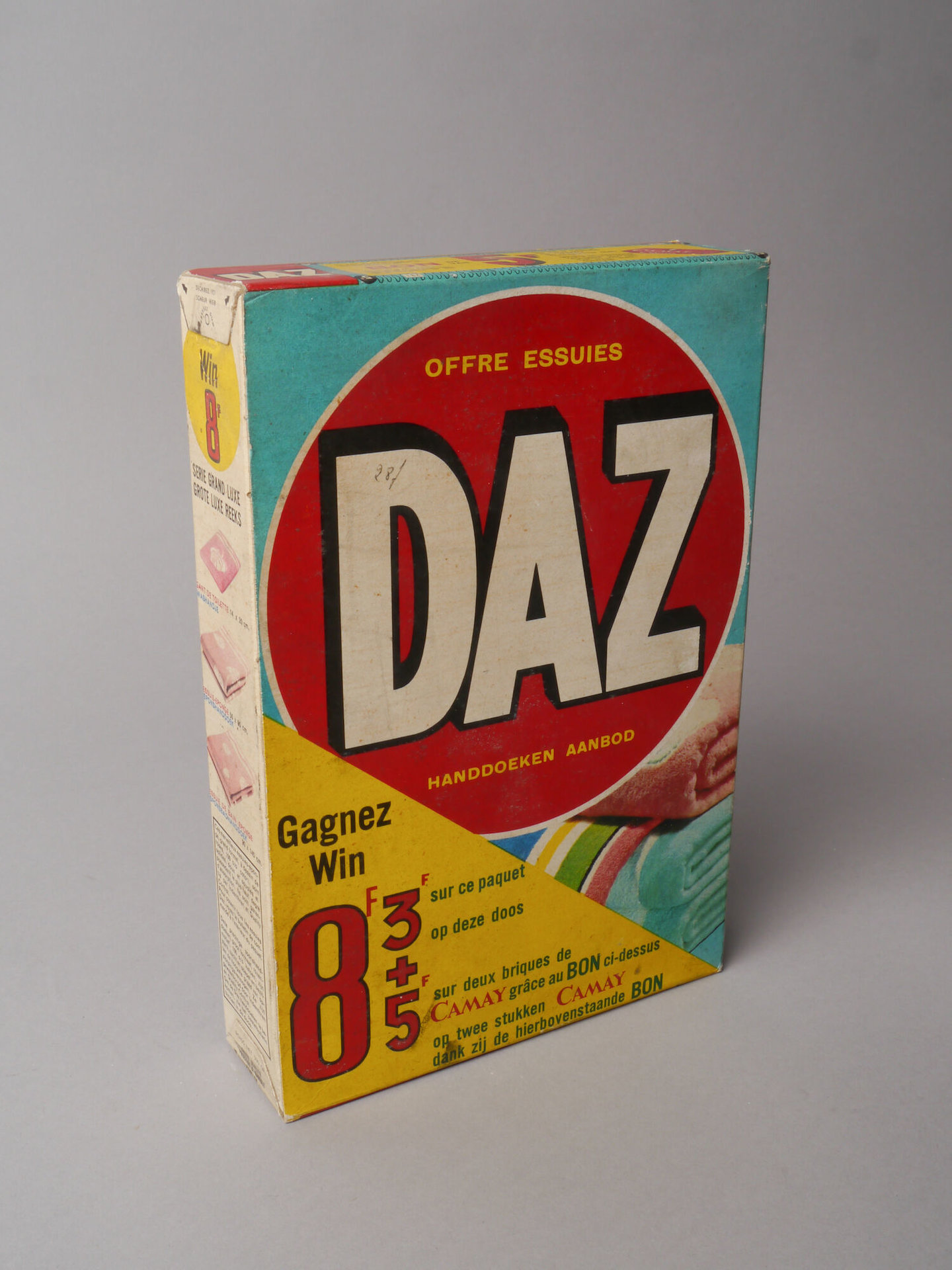 - opschriften: DAZ / HANDDOEKEN AANBOD / Win 8F / 3F op de doos + 5F op twee stukken Camay dank zij de hierbovenstaande BON // DAZ WAST PROPERDER WANT DAZ BLEEKT BETER / Wees deze gelukkige moeder: / Zij maakt zich geen zorgen meer over hardnekkige vlekken op het linnen