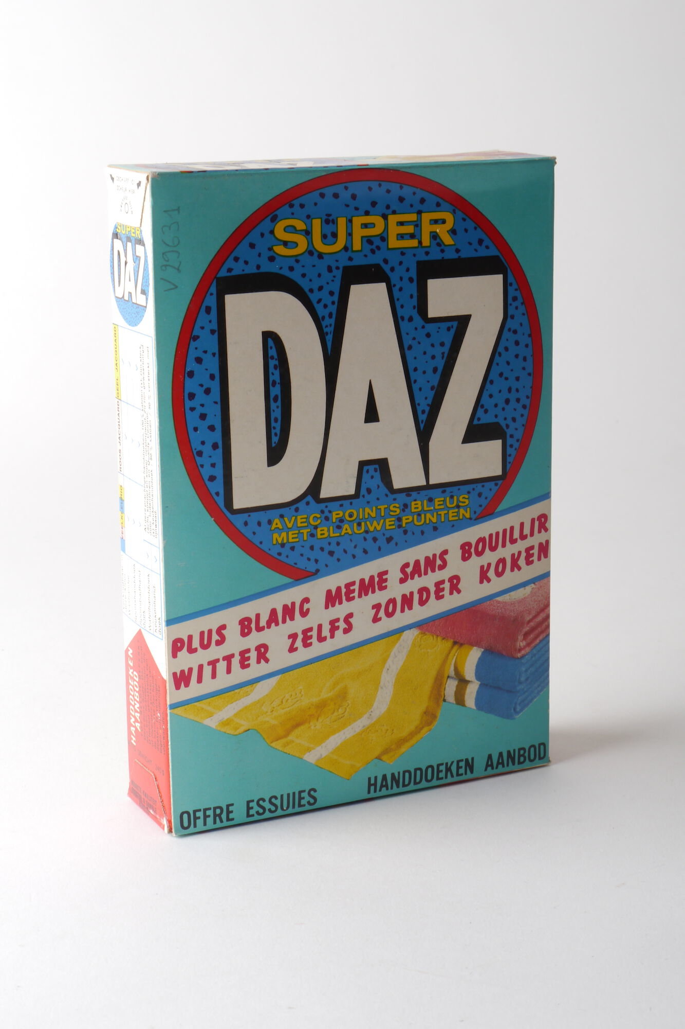 - opschriften: SUPER / DAZ / MET BLAUWE PUNTEN / witter zelfs zonder koken / HANDDOEKEN AANBOD // SUPER DAZ / WAST WITTER ZELFS ZONDER KOKEN / ...uw linnen zal witter zijn, merkelijk witter / MET SUPER DAZ