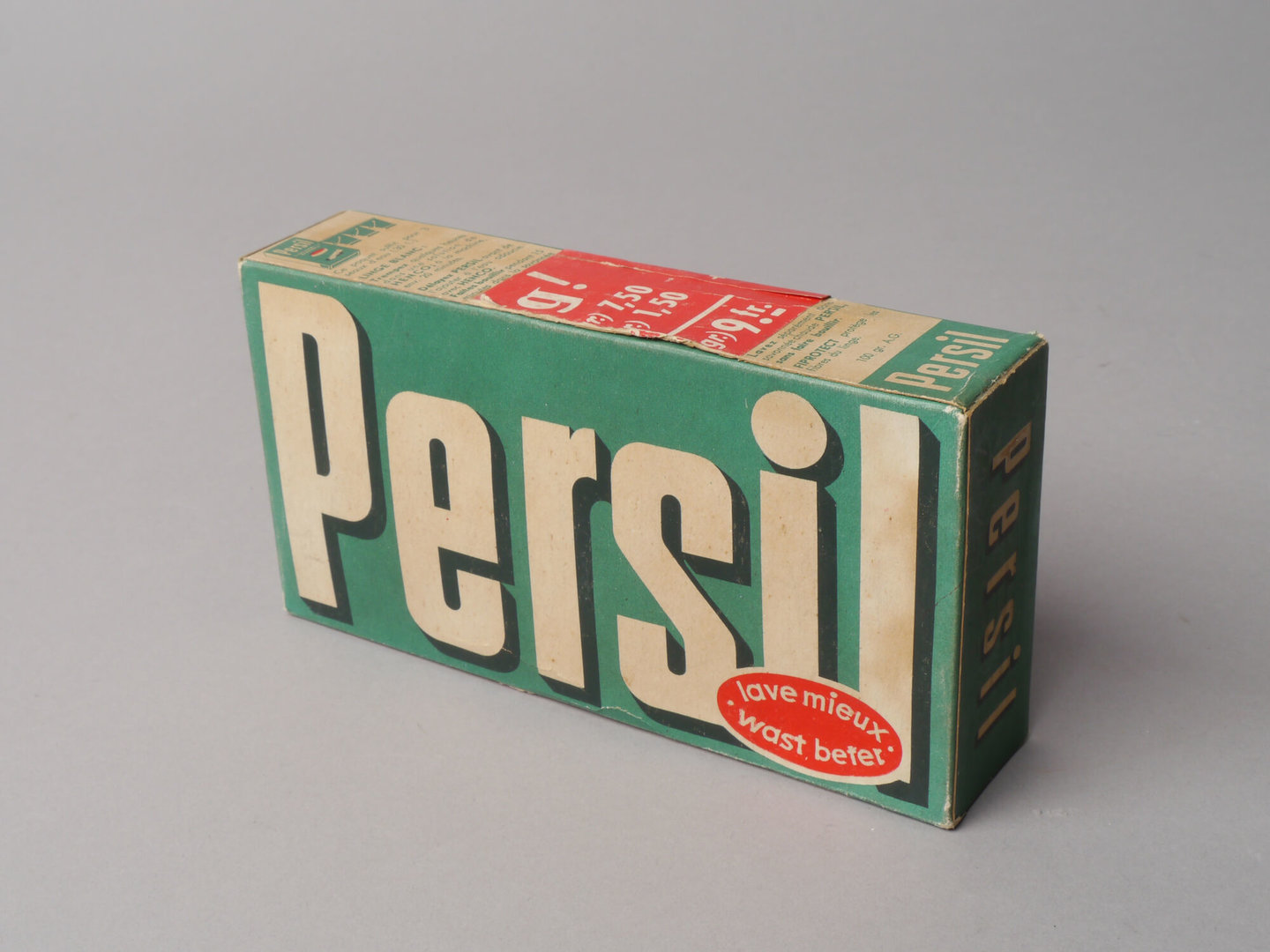 - opschriften: Persil / lave mieux / wast beter // Enig! / 1 (250 gr.) pak 7.50 / 1 (250 gr.) pak 1,50 / = 2 (500 gr.) pakken 9 fr.