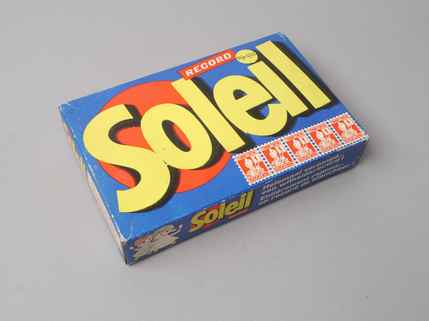 - opschriften: RECORD / Soleil // Helemaal verjongd... / een witheidsrecord ! // Het nieuwe schuim van SOLEIL RECORD is uniek. Kijk maar in uw machine: / het ontstaat heel natuurlijk (niet kunstmatig opgeblazen) en spoelt gemakkelijk weg. Het werd speciaal bestudeerd om